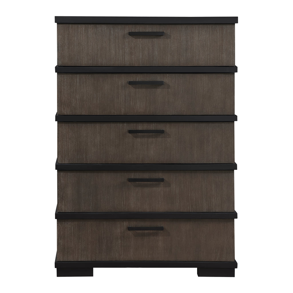 Modern lines pair with texture and hue to create the dynamic look of the Acworth Collection. The two-tone brown-ish gray and black finish over oak veneer of the collection lends to the modern-industrial inspired aesthetic that comprises the collection’s design. Black bar hardware fronts the drawers of the drawers of the chest, their minimalistic lines providing bold accent to the piece.