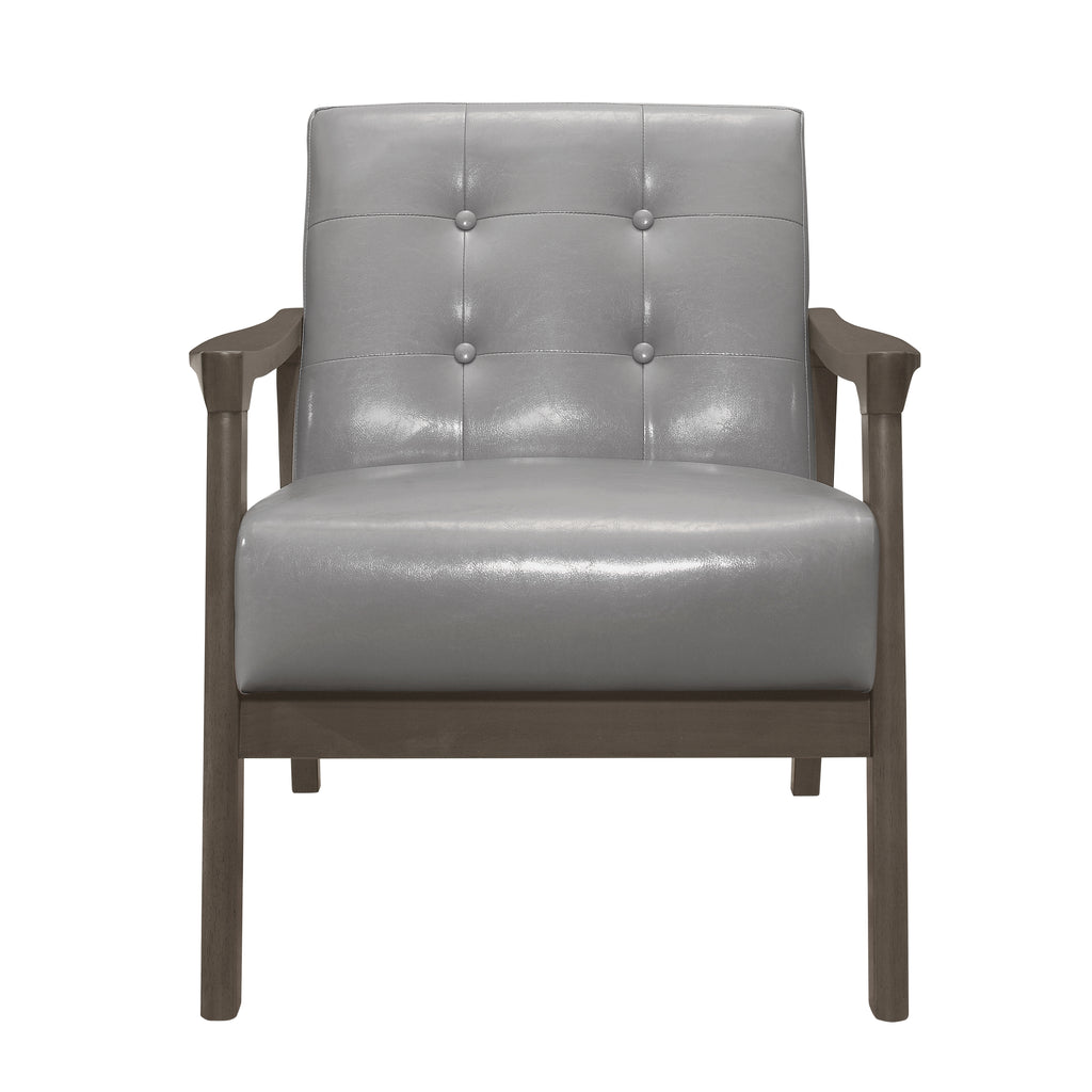 Mid-Century Modern lines define the profile of the Alby Collection accent chair. Contoured arms top the framing of the chair. The button-tufted back and plain seat of the chair are covered in gray faux leather upholstery, with gray finish over solid wood. 29 x 30.5 x 31H