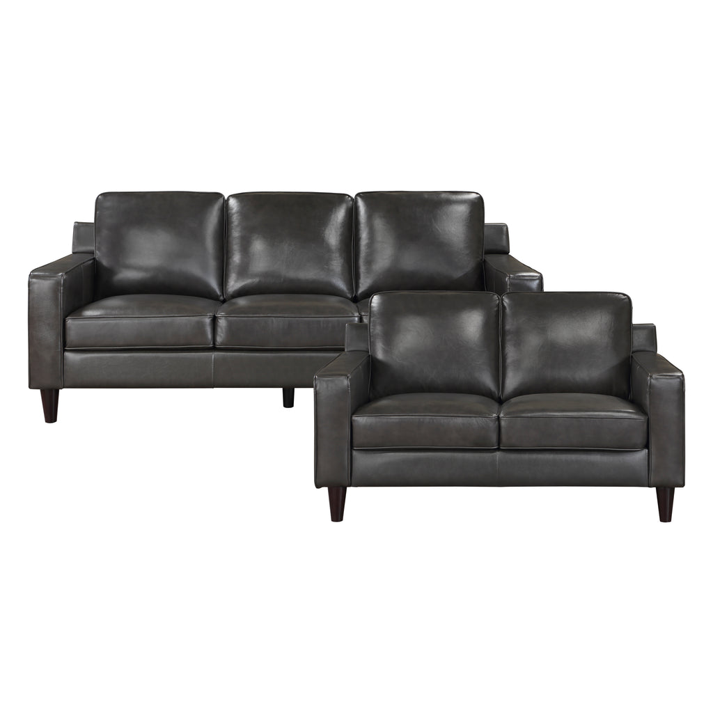 The tailored lines of the Aldrich Collection harken to the retro-inspired refinement of mid-century design, their understated elegance a perfect pairing for your living room. Gray genuine leather covers the frame of the sofa and love seat where the body touches, with faux leather match everywhere else. The modern profile of the collection is supported by conical legs, while track arms define the timeless look. None