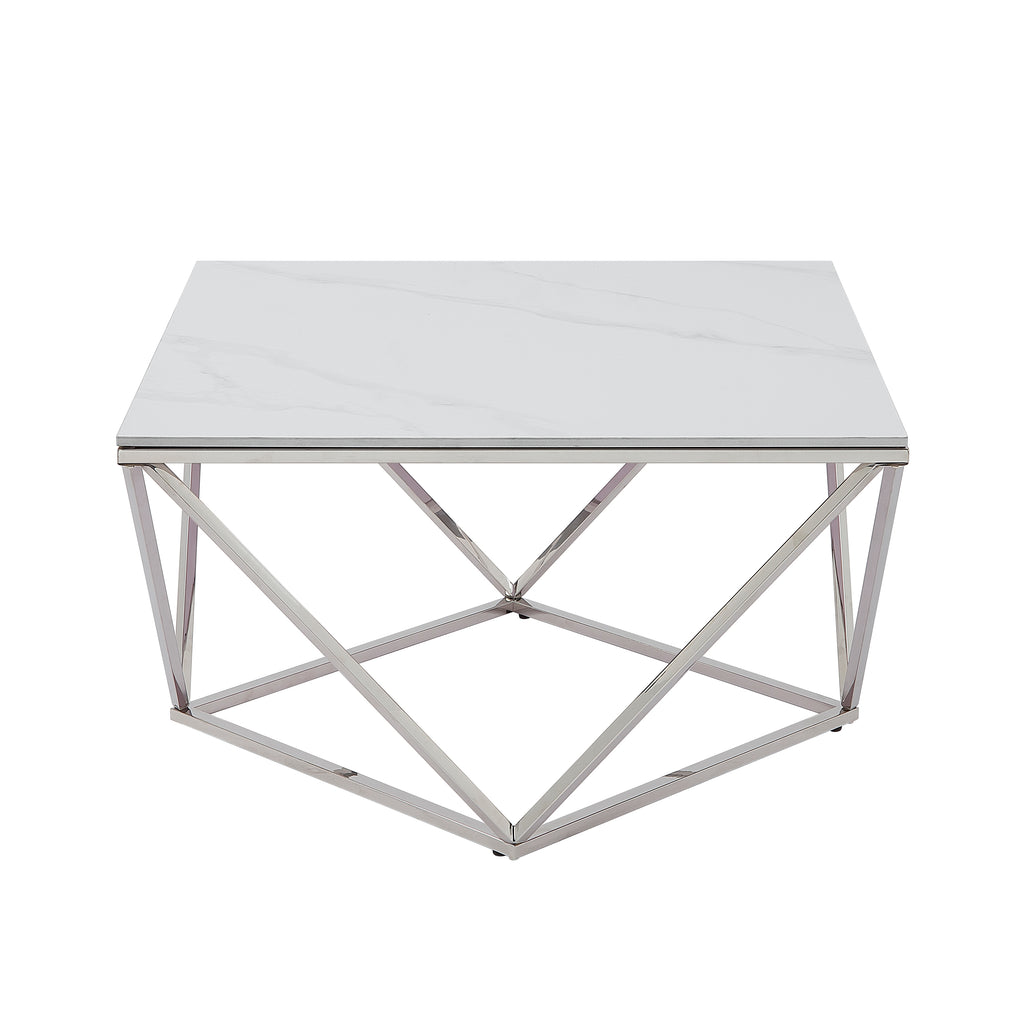 Modern refinement is captured in the design of the Alfeo Collection. Geometric lines intersect to create the unfettered stainless steel metal base frame of the cocktail table, serving to support a white sintered stone tabletop.