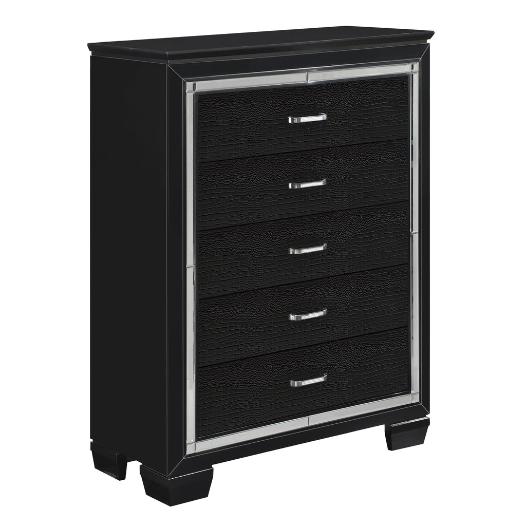 Glamour reigns in the design of the Allura Collection. Framing chest is a decorative beveled mirror accent. The alligator embossing of the drawer fronts is paired with high-polished crystal-enhanced hardware that boldly decorates the silver finish.