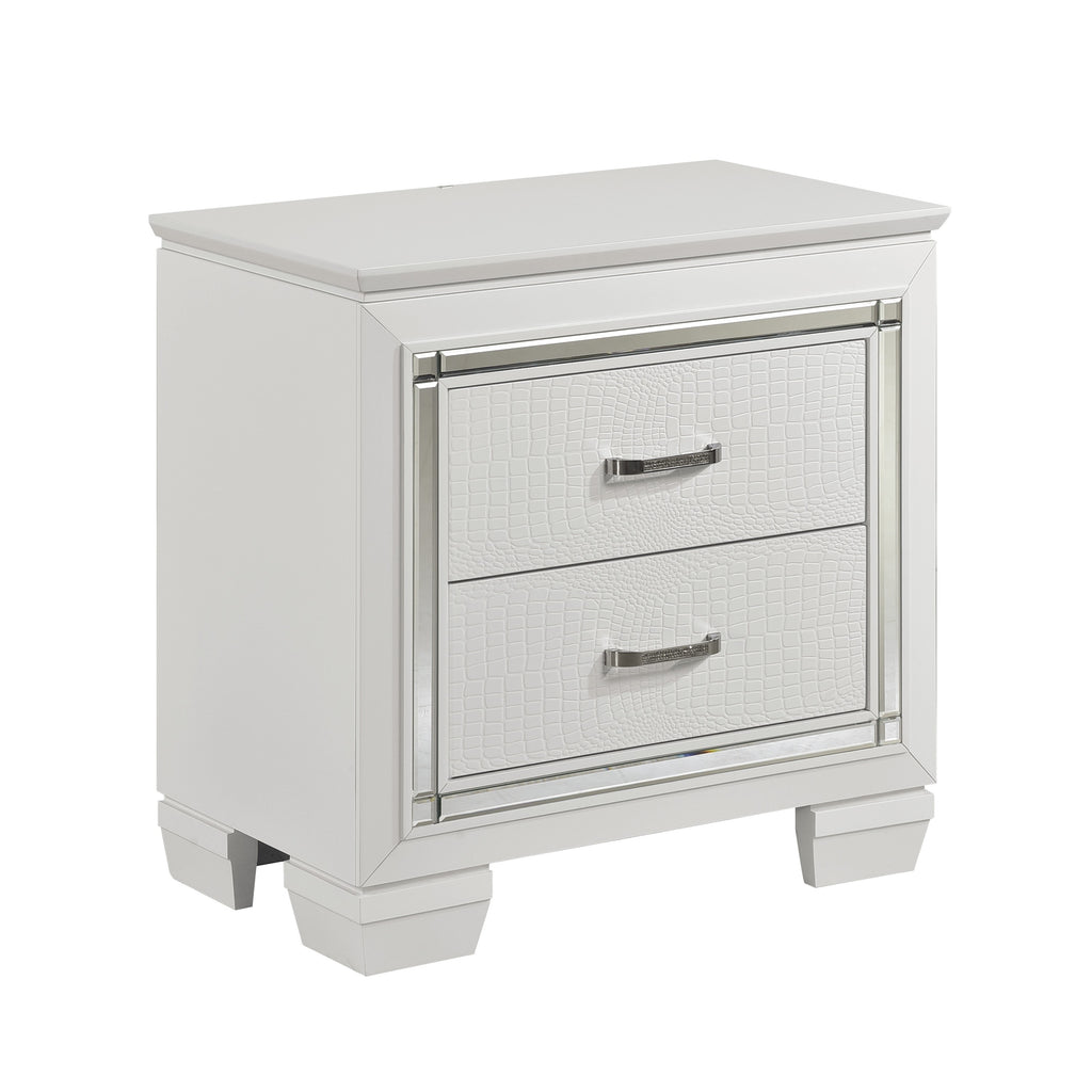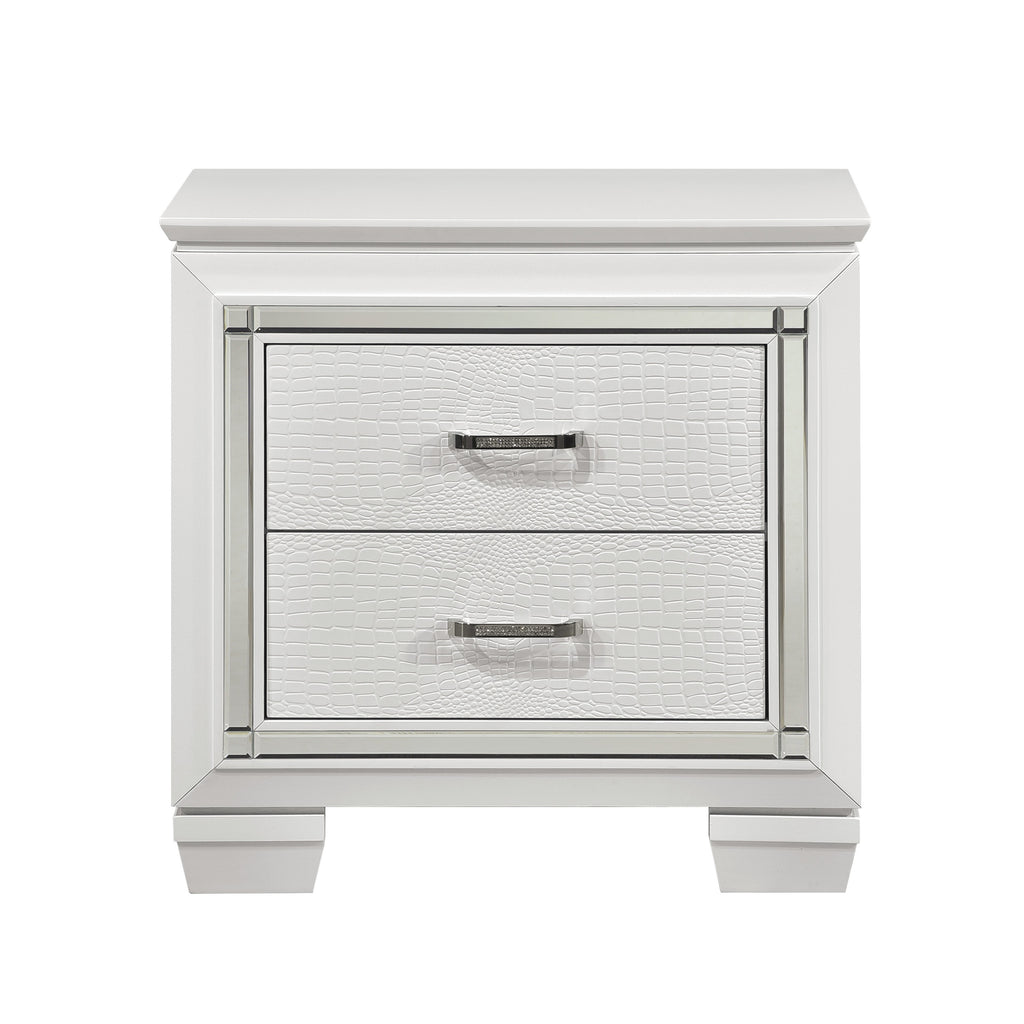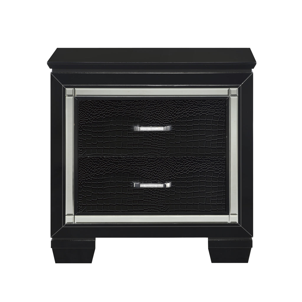 Glamour reigns in the design of the Allura Collection. Framing the nightstand is a decorative beveled mirror accent that enhances the the under-light of the night stand. Alligator embossing and high polished crystal-enhanced hardware boldly accent the black finish.