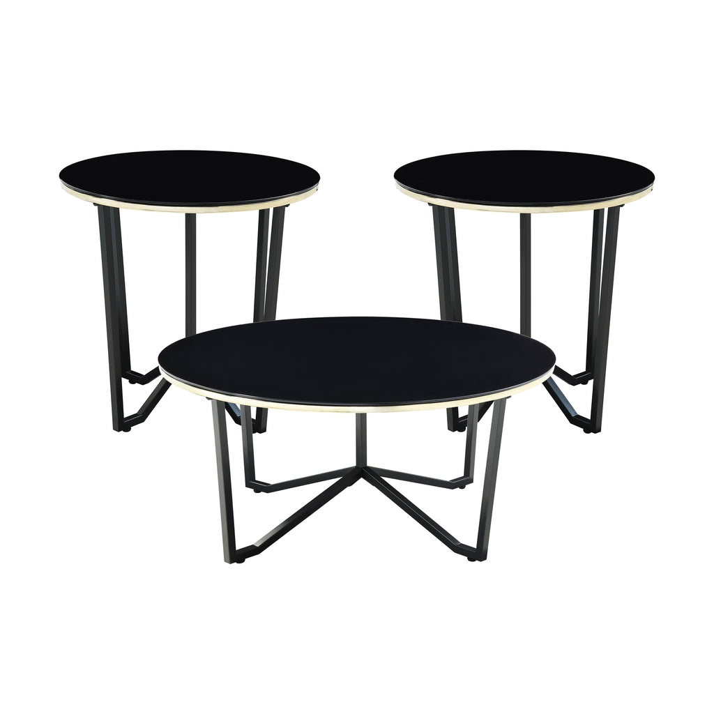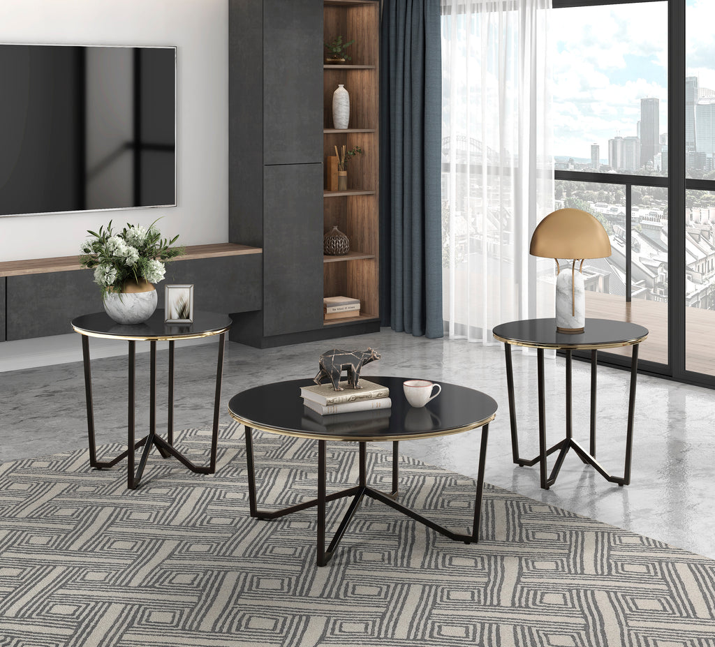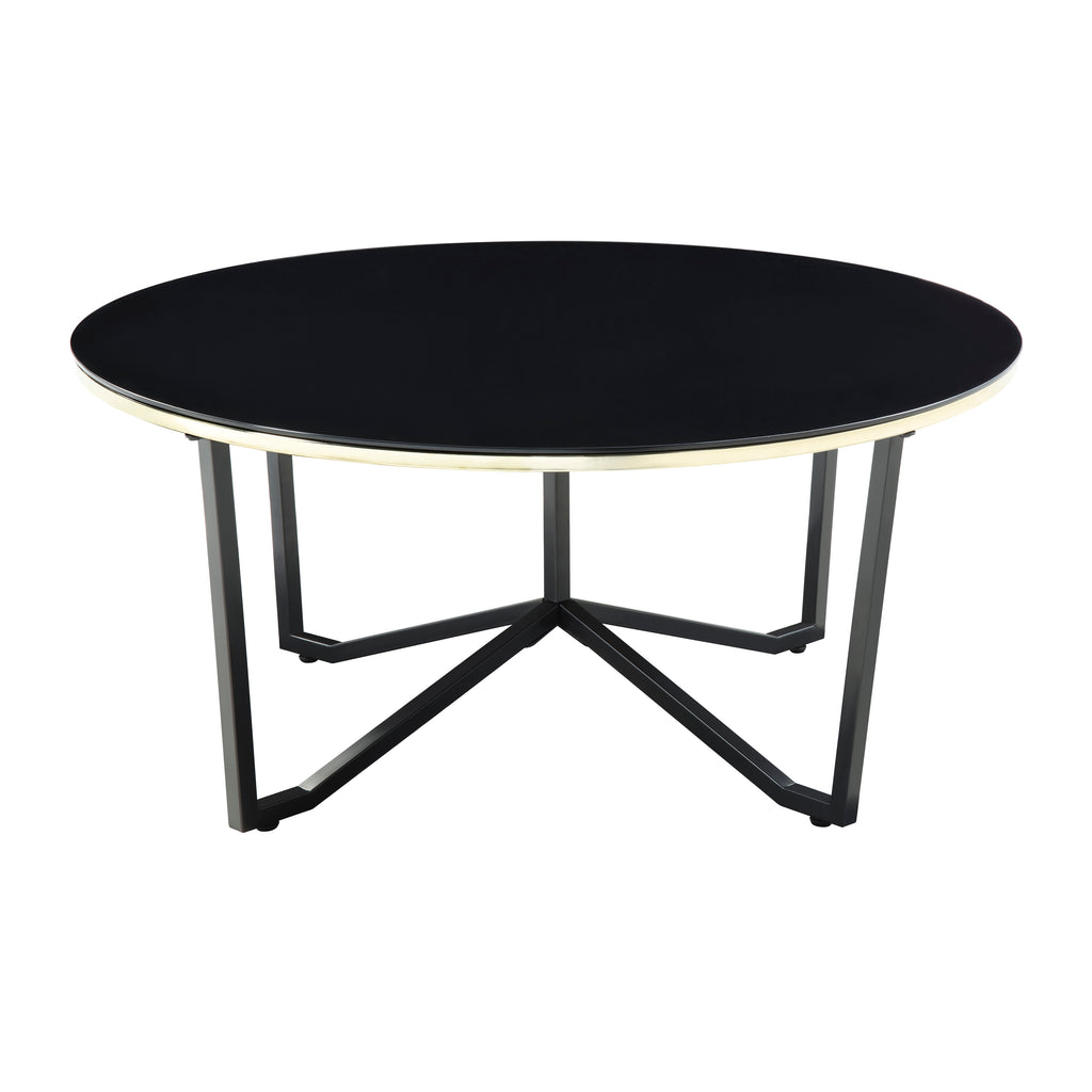 The convenient pairing of the Amara Collection’s cocktail and two end tables provides an easy addition to your home’s living room. The elegant contrast of the round black tempered glass tabletops, gold-hued banding, and metal legs creates a modern look while the round shape of the cocktail table, and two end tables, presents a classic profile, and ample tabletop display space. Cocktail Table: 36 Dia x 17H, End Table: 24 Dia x 23H