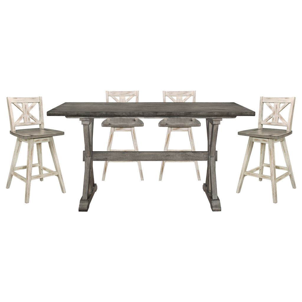 Creating a subtle rustic look is the design of the Amsonia Collection. A gray finish graces the solid rubberwood dining group highlighting the veneer. Providing visual interest beyond the classic styling, are the alternate finishes of the accompanying chairs, offered in black sand-though and white sand-through. The chairs also feature a swivel mechanism, lending to ease of motion while seated. None