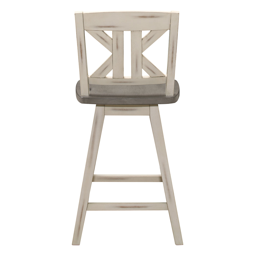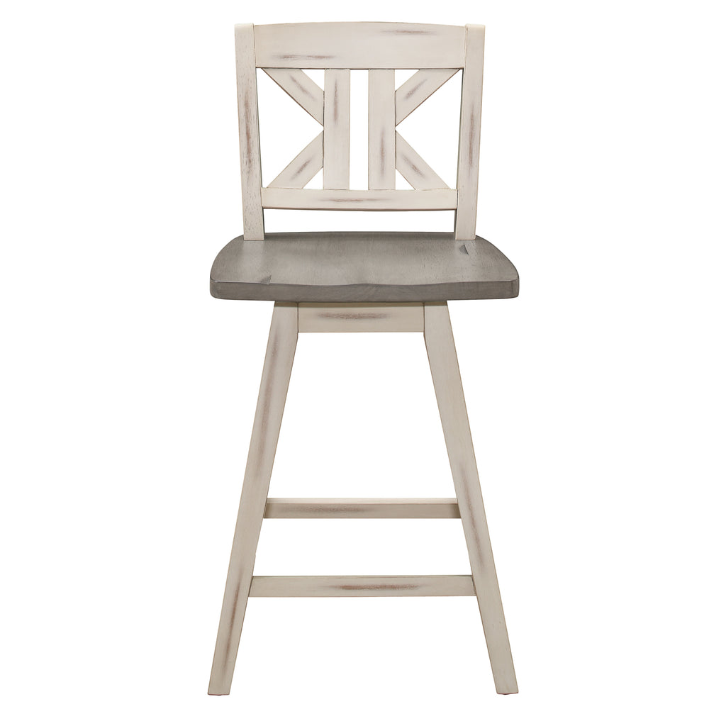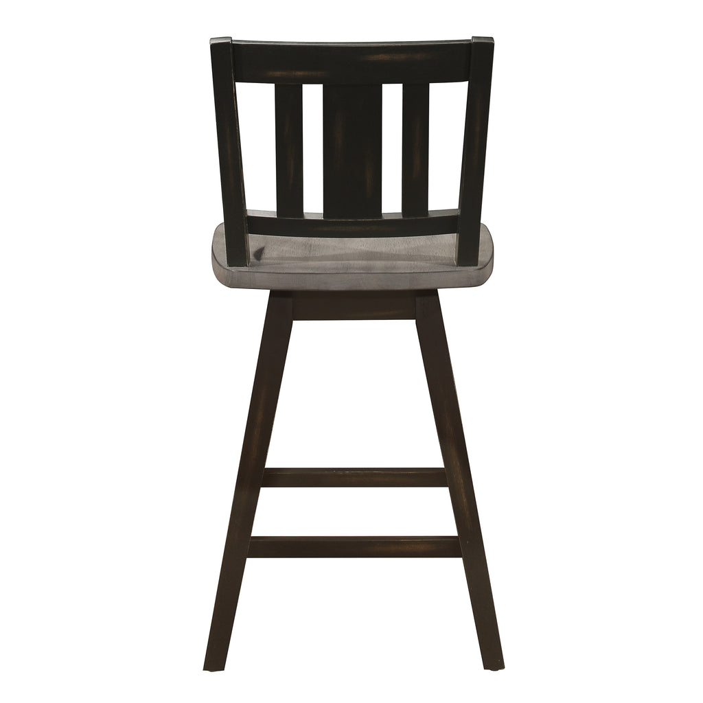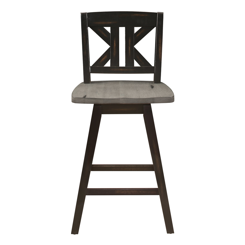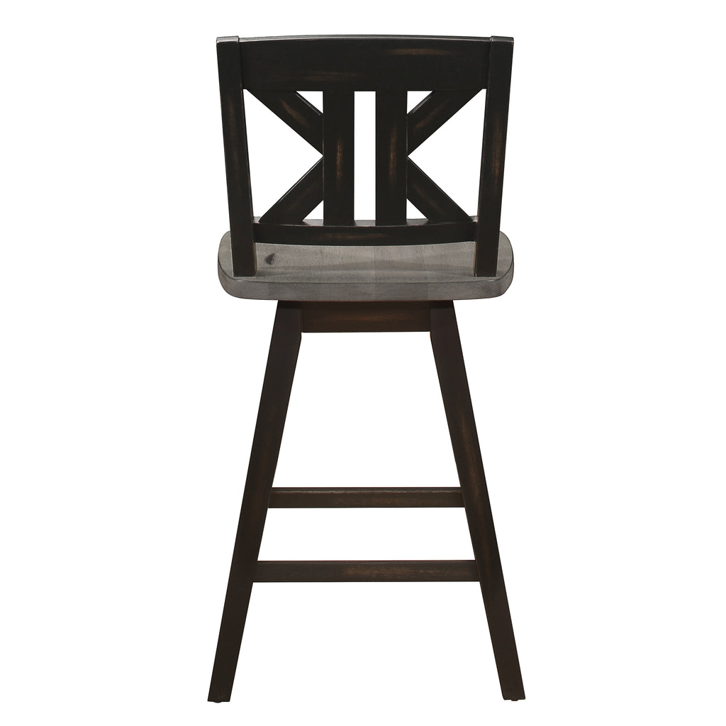 Creating a subtle rustic look for your dining space is the Amsonia Collection. A black sand-through finish graces the solid rubberwood 24-inch divided X-back swivel counter height chair, highlighting the veneer.