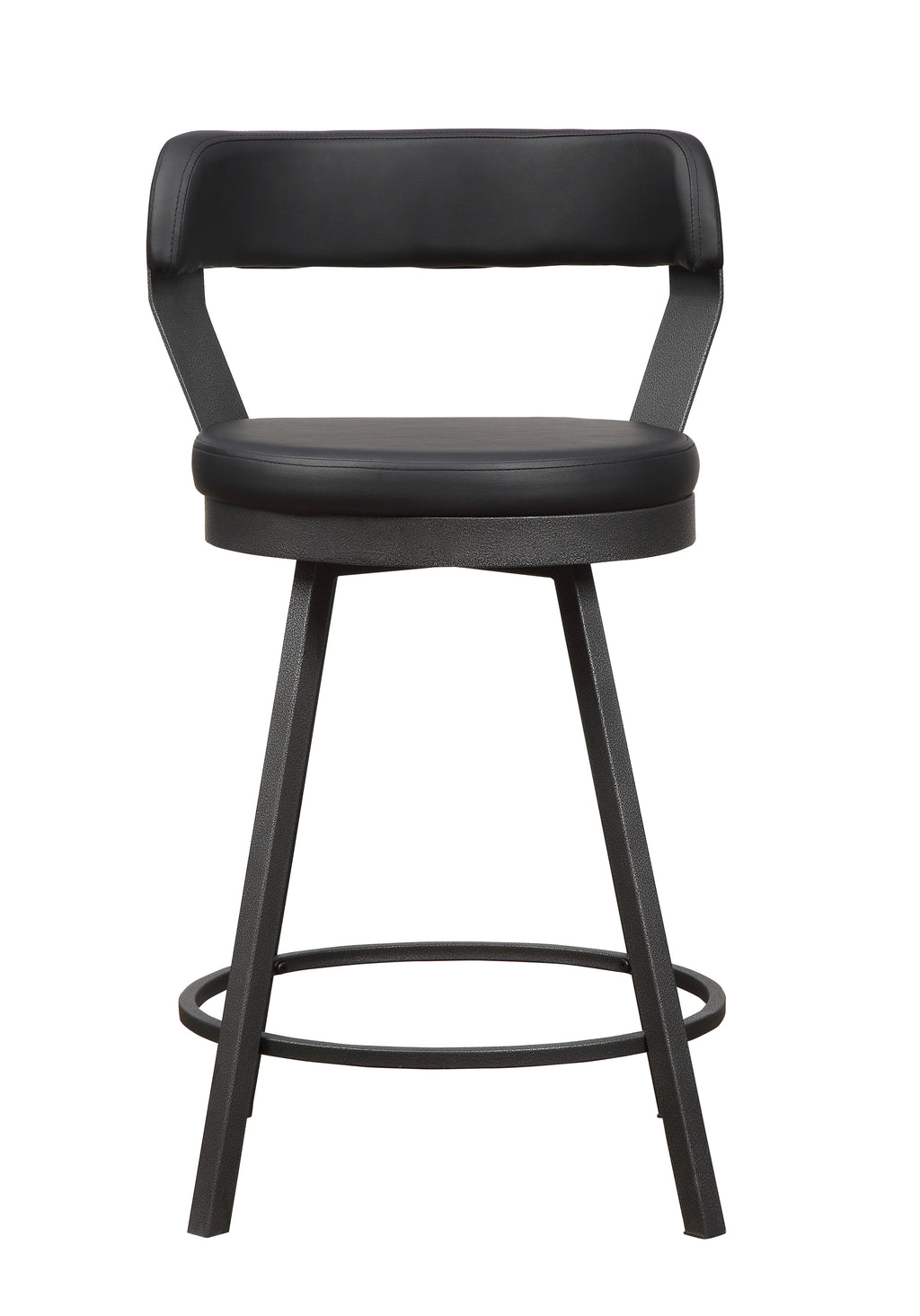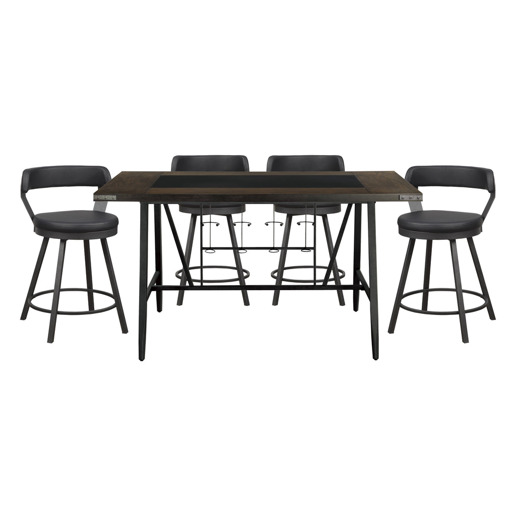 Perfectly styled for your casual dining room is the Appert Collection. This counter height offering features a dark gray metal base – with built in wine rack – that serves to support the wood top which frames a black rectangular glass insert. The round seats and back supports of the accompanying chairs are covered in faux leather. None