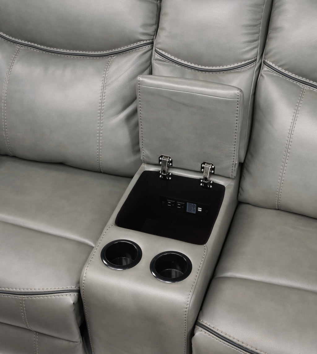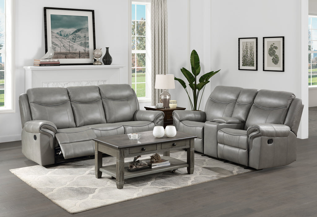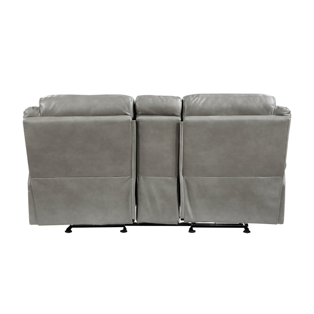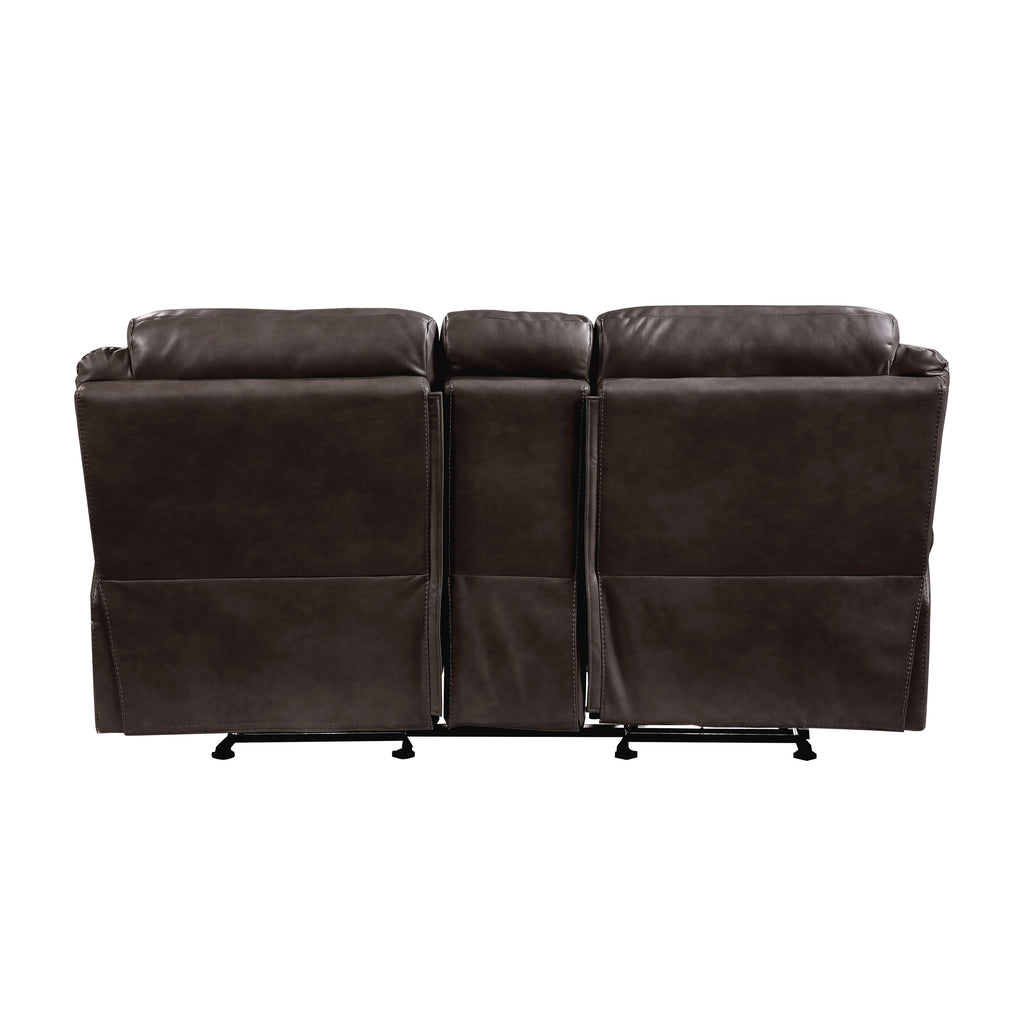 With amply appointed offerings that create not only a comfortable seating experience but a functional one as well, the Aram Collection will be a welcome addition to your home. Dark brown breathable faux leather covering for comfort and style that will blend effortlessly with your transitional decorative preference. Manual motion mechanisms operate with the pull of a side-mounted tab, that once engaged, take you from seated to reclined in an easy motion. The dual glider reclining ends of the love seat flank a center mounted console with storage, electric receptacles and cup-holders.