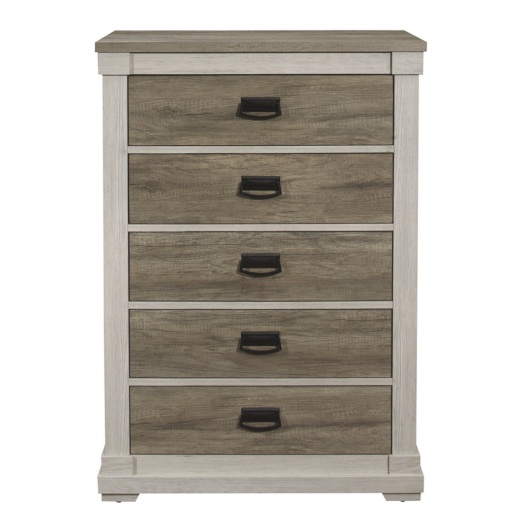 Designed for your transitionally styled bedroom is the Arcadia Collection. The two-tone look of the group is achieved with white framing and variegated gray printed faux-wood grain veneer. Dark hardware lends visual contrast to the classic shape of the chest. 34 x 17 x 48.5H