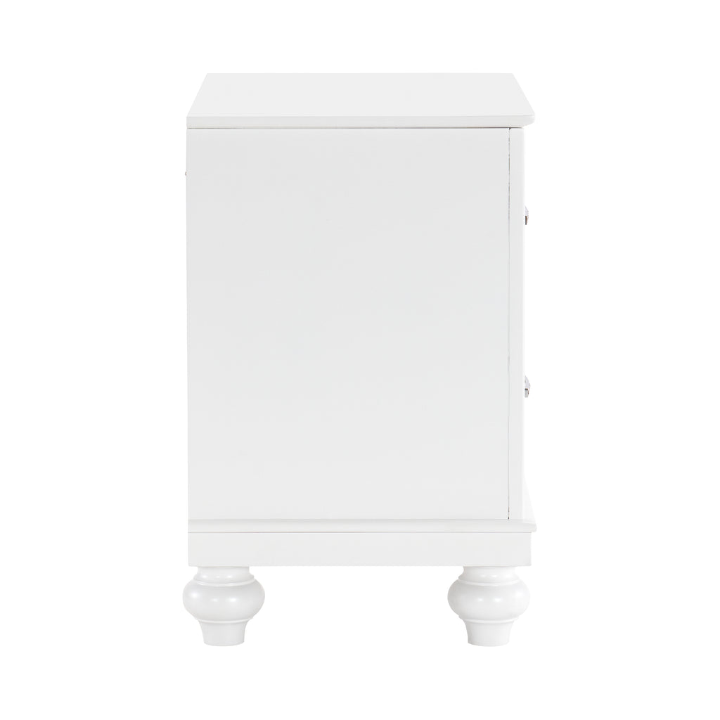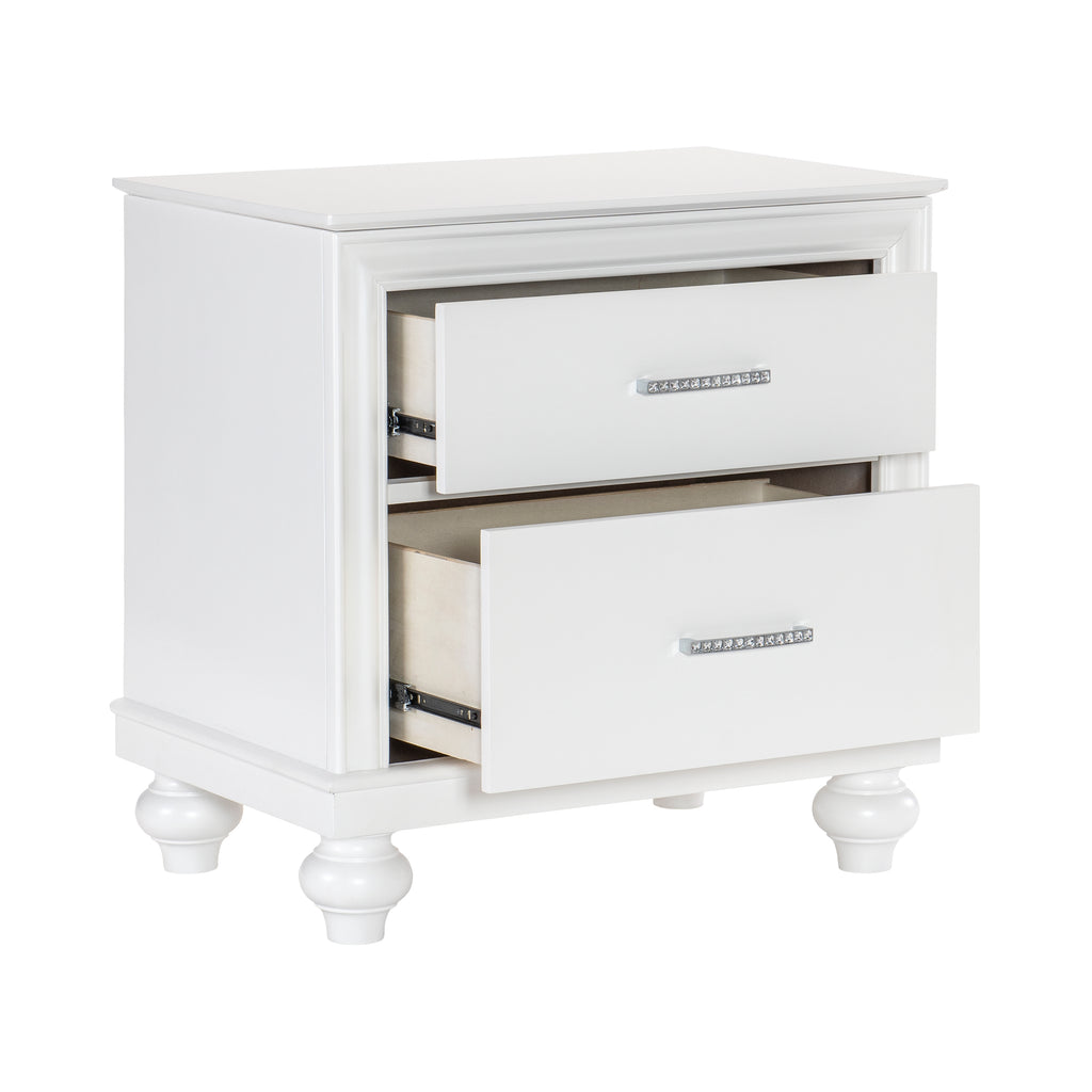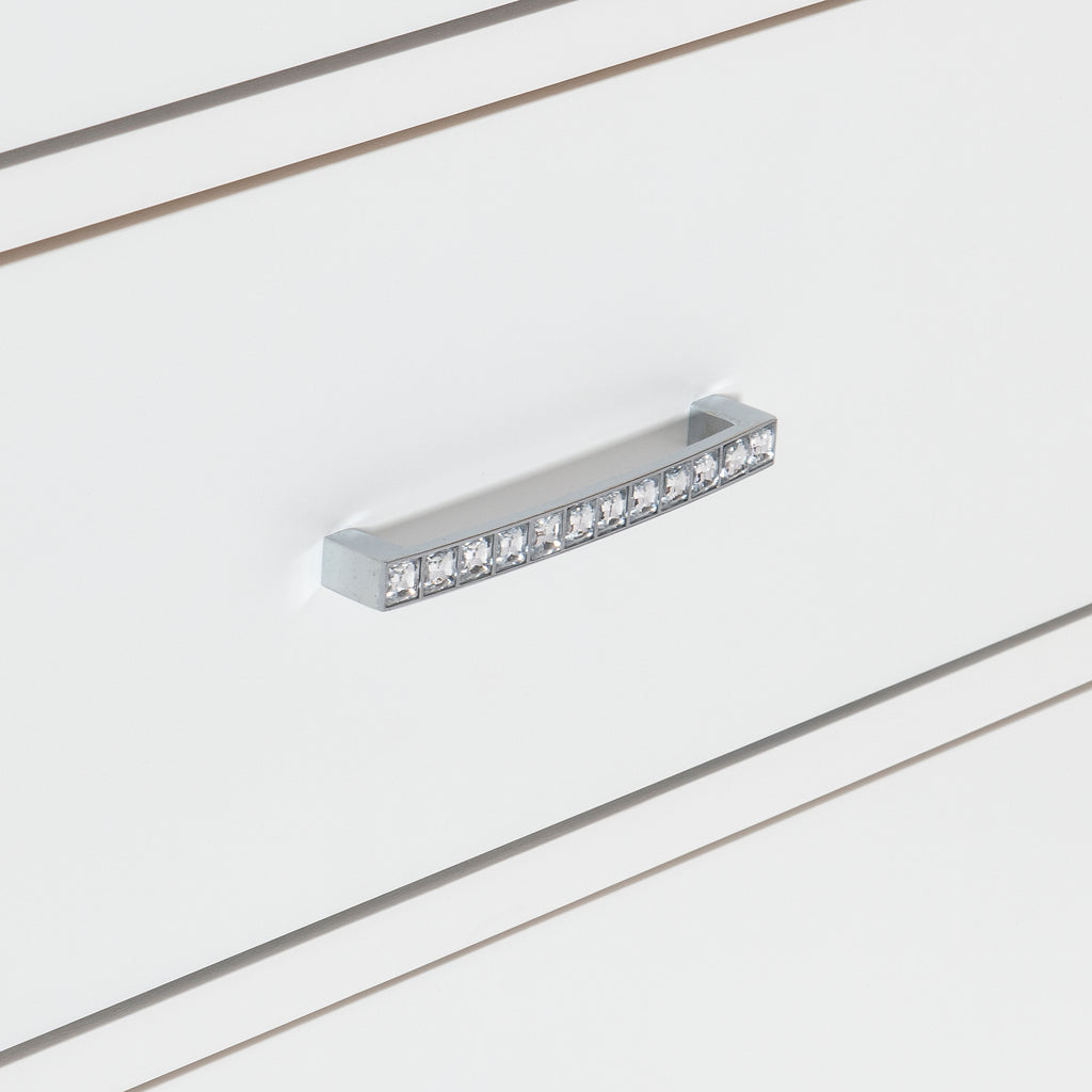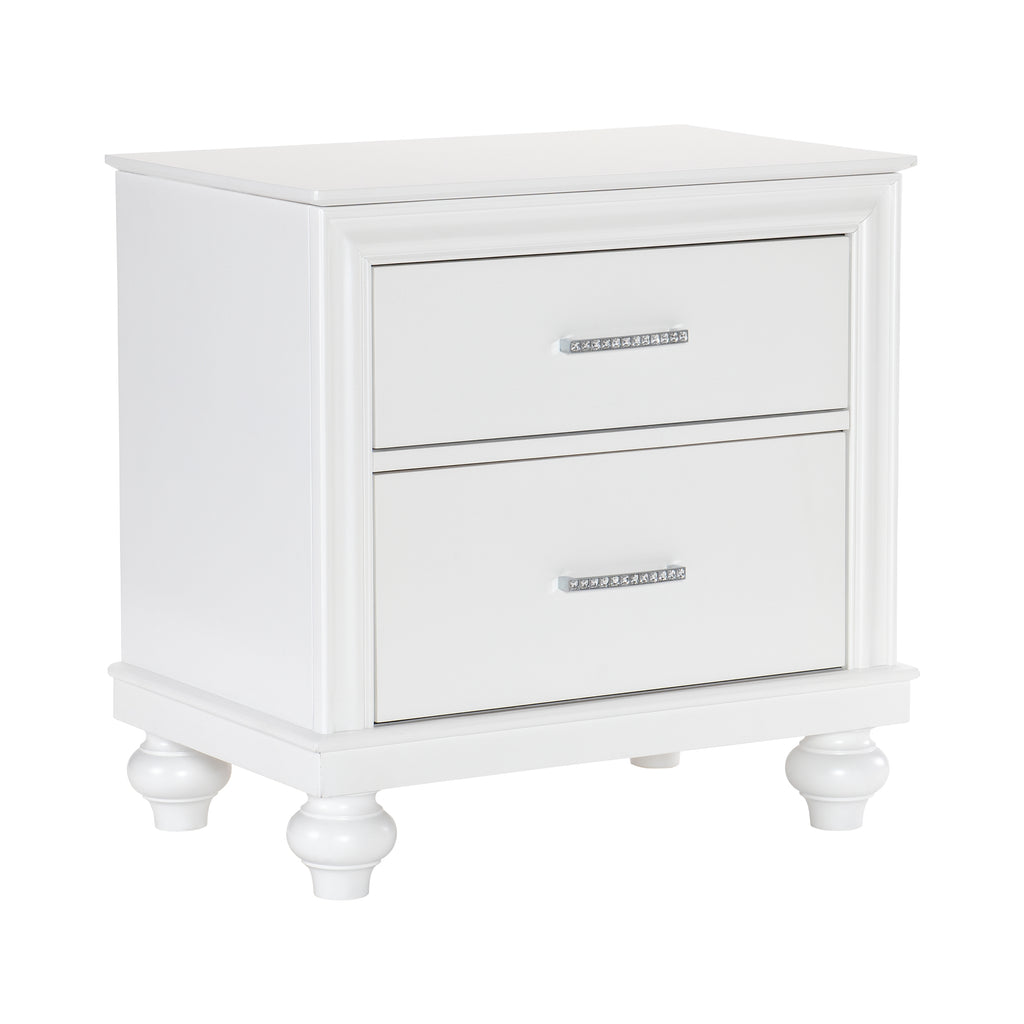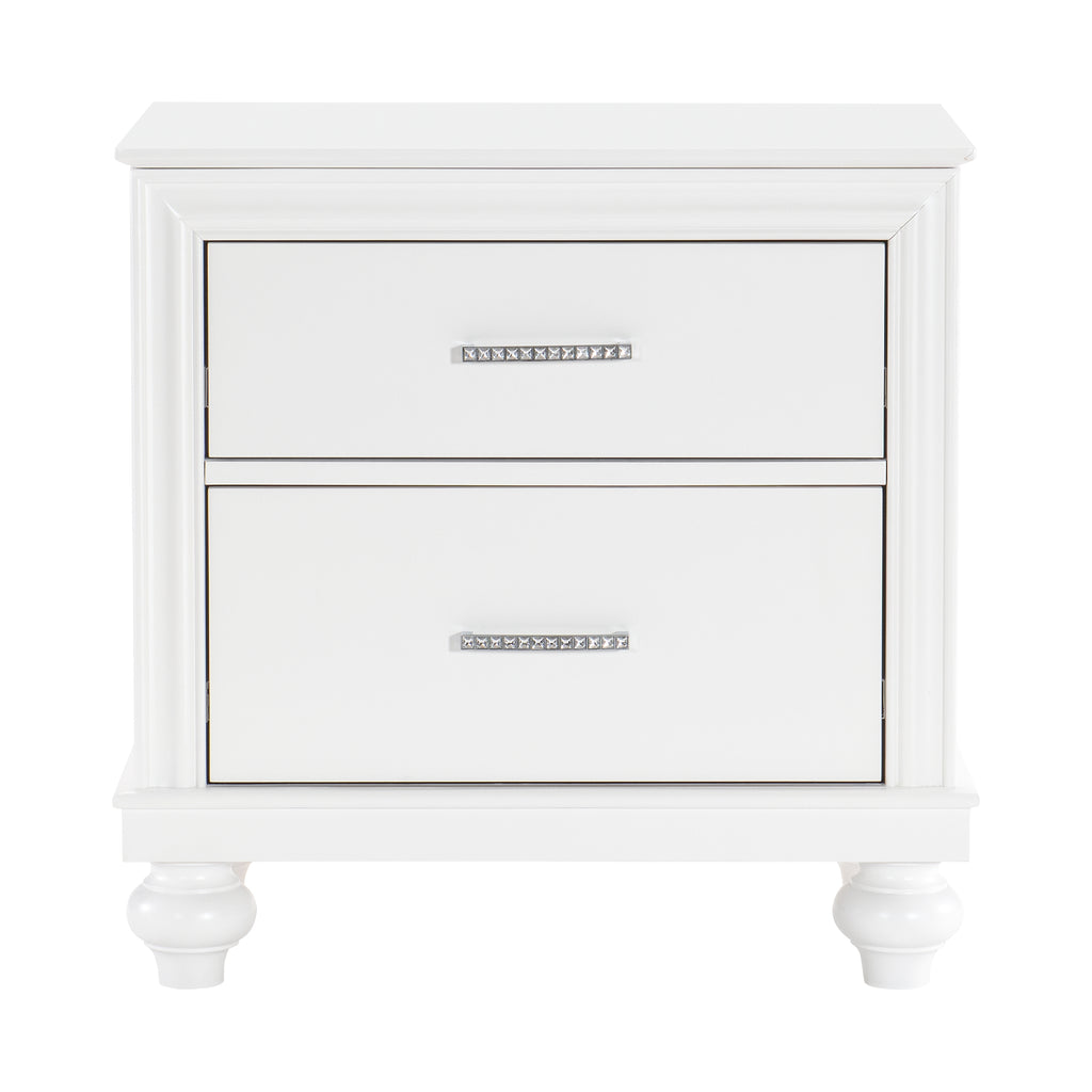 Visually mesmerizing, light dances off the accentuating details of the elegant Aria Collection. The eye-catching iridescence embedded acrylic crystal hardware that fronts each drawer of the nightstand sparkles against the bright white finish of the collection. 28 x 18 x 28.5H