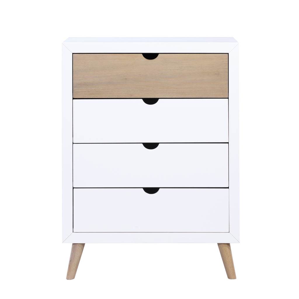 Providing the perfect landing pad for your child’s bedroom, the Asker Collection is a fun and functional addition to their space. The two-tone white and natural finish of the pine veneer is paired with the mid-century modern design to create a classic profile. The chest features a neutral finish on the top drawer, with white fronts on the bottom drawers. Grooved hand openings center each drawer front serving as an easy access point for drawer extension.