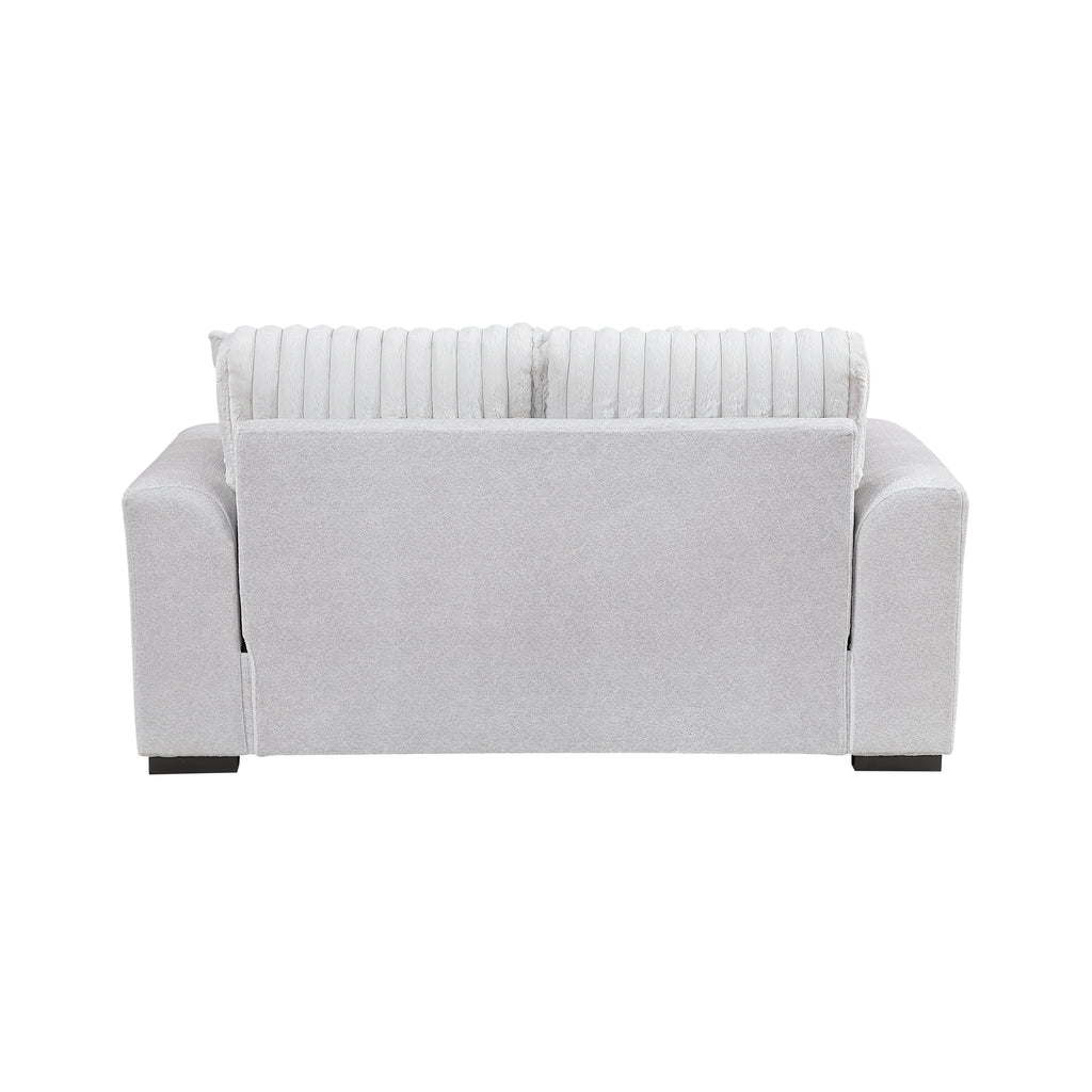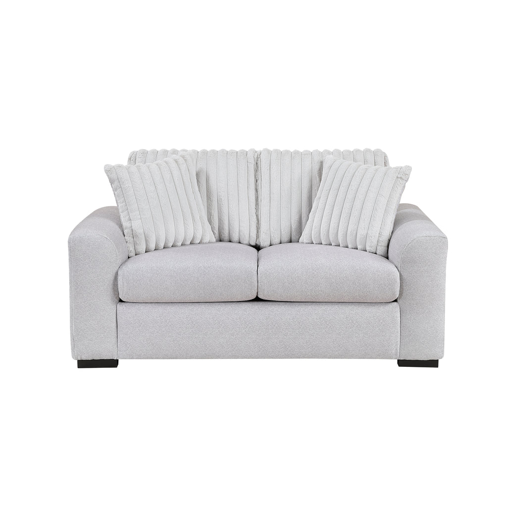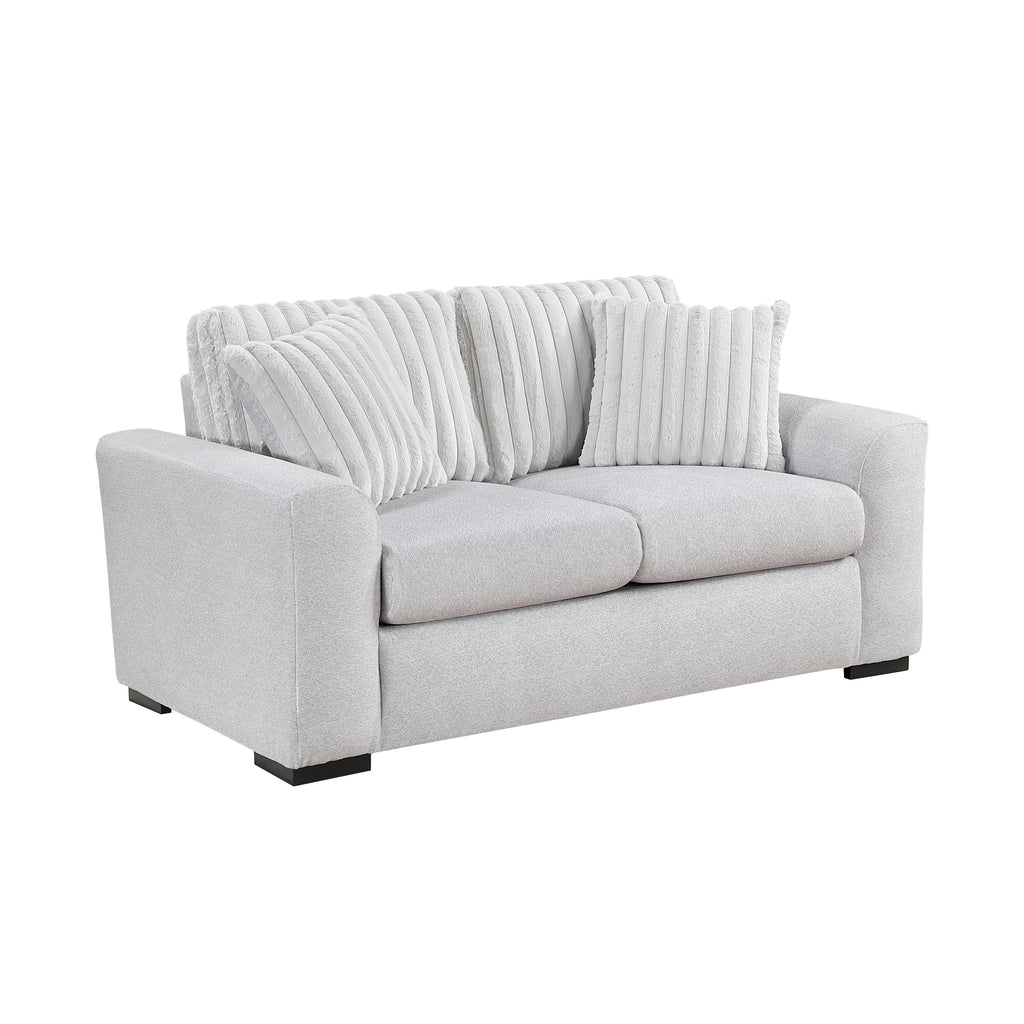 Create a cozy and stylish seating area with this two-tone gray loveseat, featuring a unique blend of textured microfiber and inviting corduroy fabrics. Built with a sturdy plywood frame, high-density foam padding over pocket coils, and reversible cushions, this loveseat offers both durability and exceptional comfort for two. The removable cushion covers with zippers make cleaning a breeze, while the solid wood feet in a sleek black finish provide a modern foundation. Two matching pillows are included to enhance both comfort and style. With a 300lb weight capacity per seat (600lb total) and easy assembly, this loveseat is perfect for apartments, small living rooms, or any space needing a touch of contemporary charm.