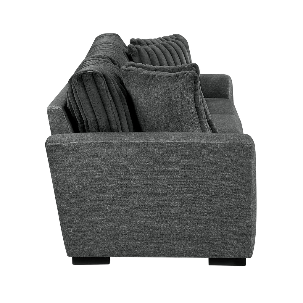 Create a stylish and comfortable centerpiece for your living room with this two-tone dark gray sofa, featuring a unique blend of textured microfiber and inviting corduroy fabrics. Built with a sturdy plywood frame, high-density foam padding over pocket coils, and reversible cushions, this sofa offers both durability and exceptional comfort for three. The removable cushion covers with zippers make cleaning a breeze, while the solid wood feet in a sleek black finish provide a modern foundation. Four matching pillows are included to enhance both comfort and style. With a 300lb weight capacity per seat (900lb total) and easy assembly, this sofa is perfect for family gatherings, movie nights, or everyday lounging.