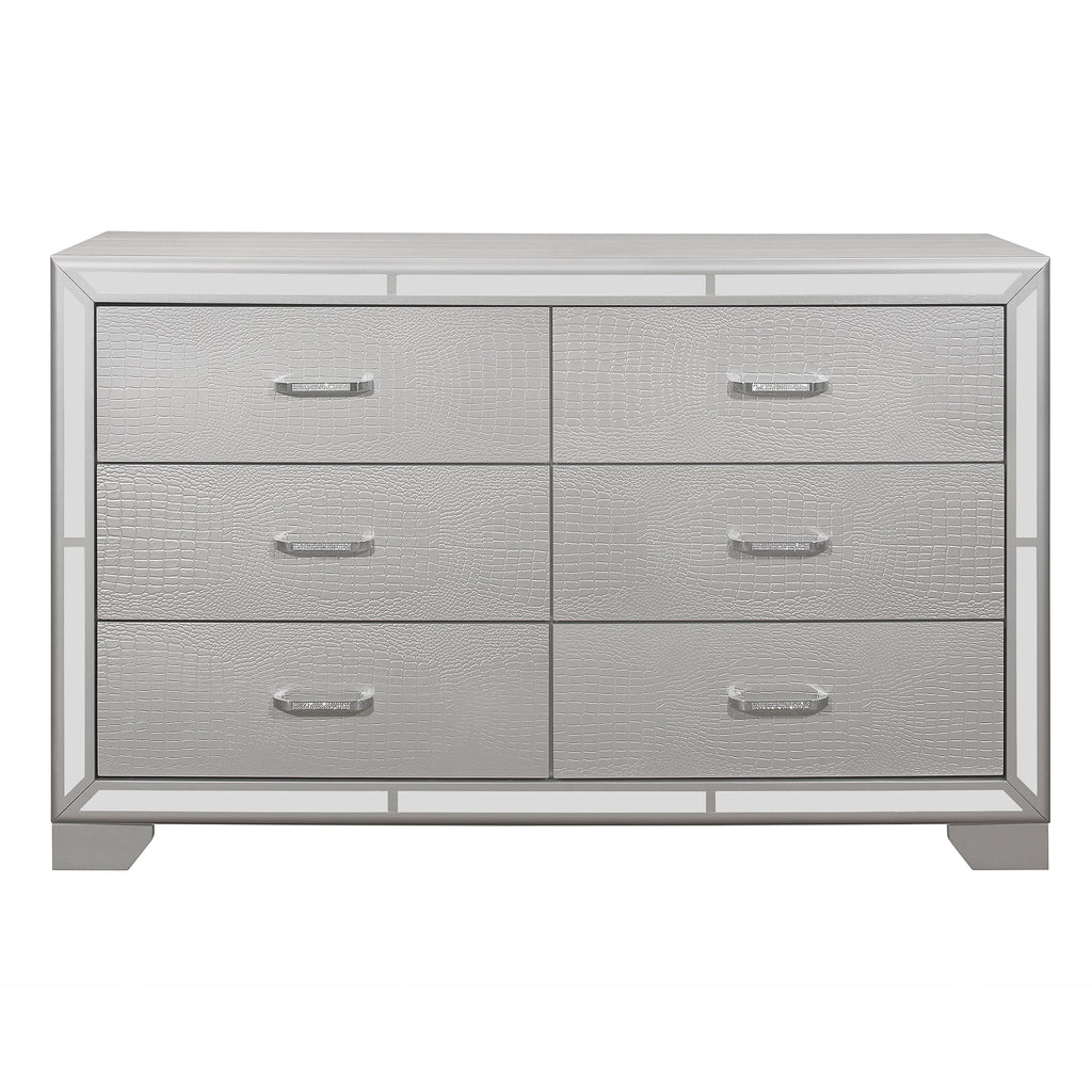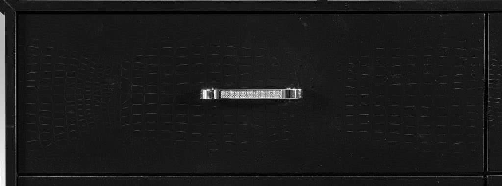 Elegant touches abound with the design of the Aveline Collection. Alligator embossed veneer covers the collection and is finished in black, an elegant palette that beautifully pairs with your bedroom’s accessories. The dresser is framed with mirror trim, while the drawers are fronted with chrome-finished faux-crystal inlay bar hardware, each accent a perfect decorative touch to reflect your glamorous style.