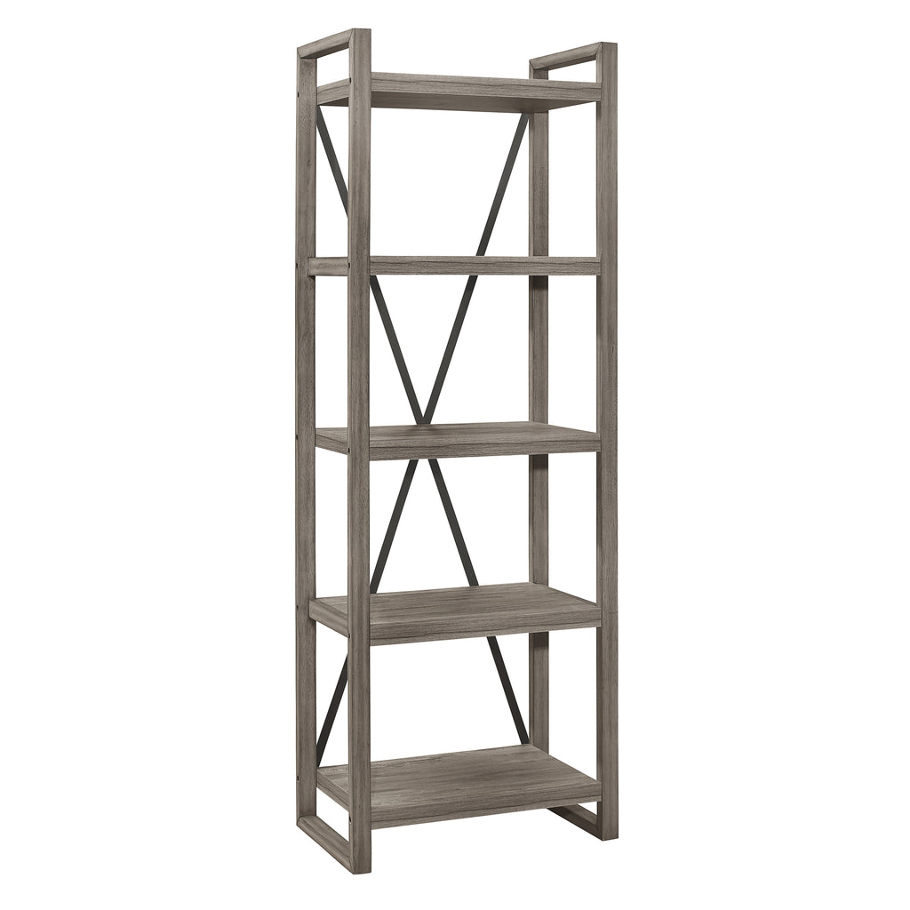 Following the trend of rusticated simplicity is the Bainbridge Collection. Melamine laminate perfectly mimics the look of weathered gray wood, lending to the rustic style. The transitional framing of the bookcase side pier allows for placement in myriad home settings, creating the perfect canvas for your preferred decorative style. The bookcase’s profile is comprised of continuous exterior framing supported by metal X-back supports. The unit allows for open display and convenient storage within your casual living space.