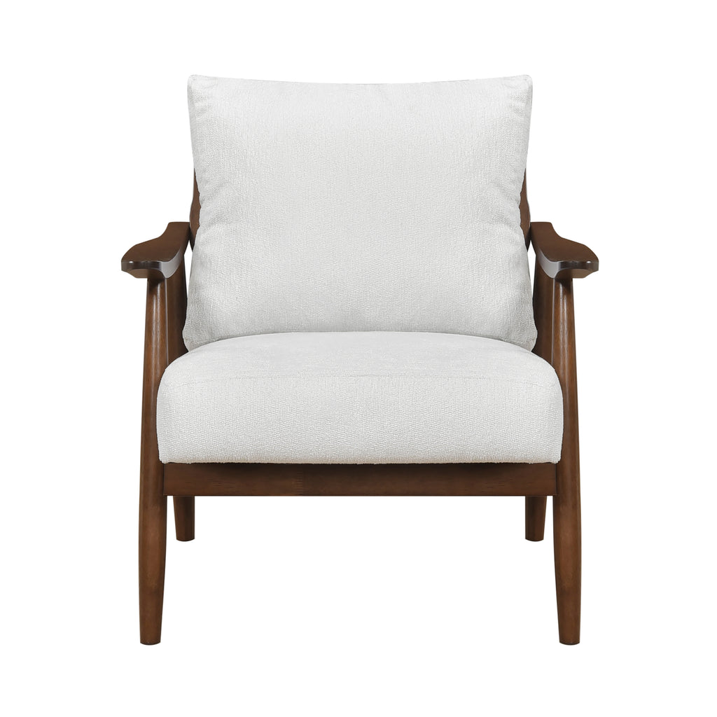Bring a touch of classic mid-century modern design to your living space with this stylish wood accent chair. Featuring a slatted backrest crafted from rich, dark-stained wood, this chair offers a unique blend of visual interest and airy comfort. The soft, chenille fabric cushions in a neutral tone provide a comfortable seating experience, while the clean lines and tapered legs embody the timeless elegance of mid-century aesthetics. Perfect for adding a sophisticated touch to your living room, reading nook, or bedroom, this chair effortlessly combines style and functionality.