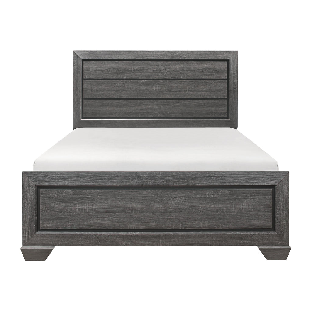 Blending the elements of contemporary design and rustic aesthetic, the Beechnut Collection is a unique addition to your master, youth or guest bedroom. Dark under-paneling serves to highlight gray finish, enhancing the embossed faux-wood veneer of the raised panels on the bed and case goods. Contrasting cup hardware punctuates each drawer front. None