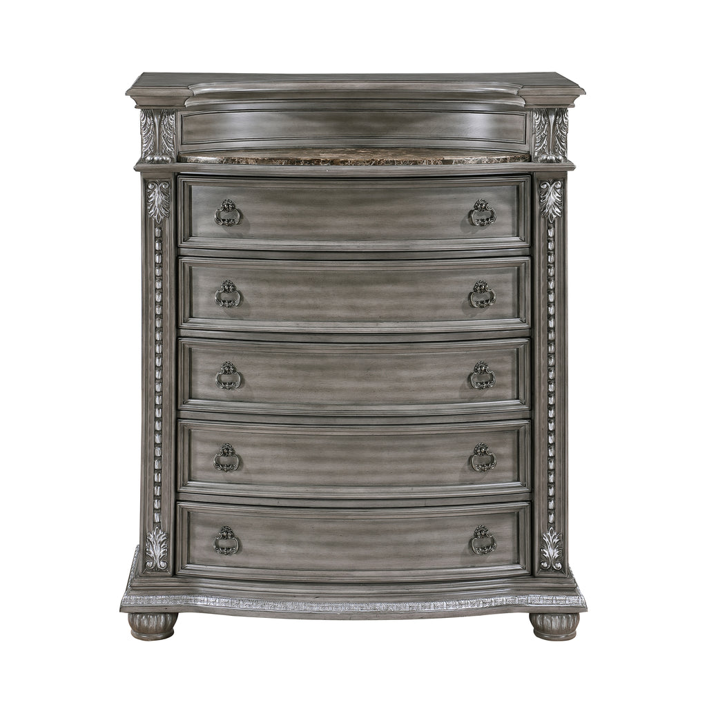 The luxurious grandeur that permeates the design of the Bennington Collection is an amalgamation of classic accenting and traditional lines. Carved bun feet, acanthus leaf carving, bead molding, and elegant framing account for the beautiful profile that defines the chest’s design. Antique pewter-finished knob and ring pull hardware fronts the drawers, and marble tops the piece. The gray finish, over acacia veneer, features subtle silver tipping for final luxurious accent.