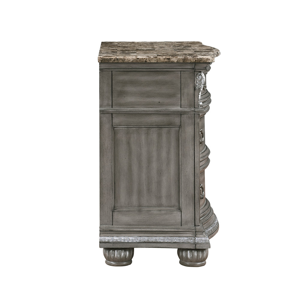 The luxurious grandeur that permeates the design of the Bennington Collection is an amalgamation of classic accenting and traditional lines. Carved bun feet, acanthus leaf carving, bead molding, and elegant framing account for the beautiful profile that defines the nightstand’s design. Antique pewter-finished knob and ring pull hardware fronts the drawers, and marble tops the piece. The gray finish, over acacia veneer, features subtle silver tipping for final luxurious accent.