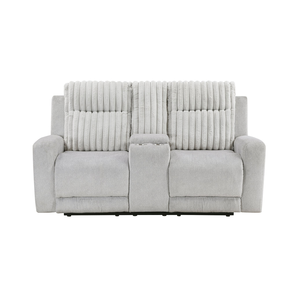 Experience shared comfort and convenience with this two-tone gray reclining loveseat, featuring a unique blend of textured microfiber and cozy corduroy fabrics. Built with a robust solid wood and plywood frame, metal reinforced seats, and foam padding over pocket coils, this loveseat offers both durability and exceptional support. The independent tab pull reclining mechanisms allow each person to relax comfortably, while the center console with two cup holders adds a touch of functionality for movie nights or lounging. With a 300lb weight capacity per seat (600lb total), this loveseat is perfect for enhancing your living room or entertainment space with a blend of modern design and luxurious comfort.