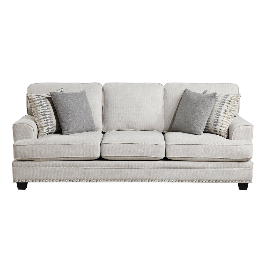 With a transitional design that is a complement to your home’s living room, the Bradford Collection utilizes classic lines, refined texture, and traditional accenting to achieve a universally appealing look. The sofa is covered in sand-hued chenille fabric upholstery. Nail head trim accents the base rails, while profile-defining welting provides a tailored finish. Complementing contrast toss pillows are paired with the sofa.