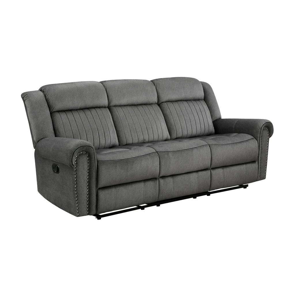 Styled for the transitional home, the Brennen Collection’s comfortable presence will be a perfect match for your casual living room. The sofa of the collection features manual reclining mechanisms allowing for ease of motion when going from seated to reclined. Plush seating is defined by the contoured stitching, while the arms of the sofa are accented with nail head trim. Charcoal-hued textured microfiber covers the seating group, providing soft touch and decorative versatility.