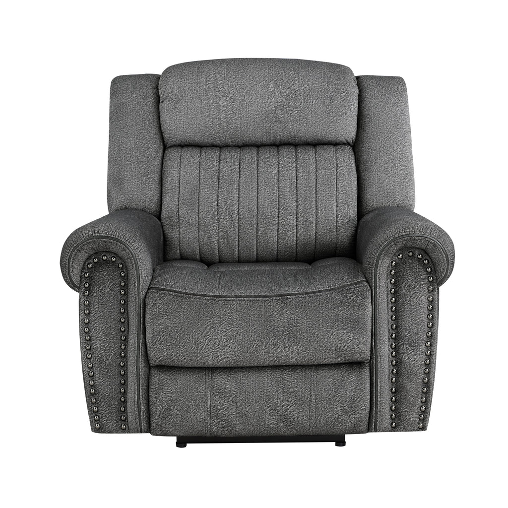 Styled for the transitional home, the Brennen Collection’s comfortable presence will be a perfect match for your casual living room. The chair features a power reclining mechanism allowing for ease of motion when going from seated to reclined. Plush seating is defined by the contoured stitching, while the arms of the chair are accented with nail head trim. Charcoal-hued textured microfiber covers the seating group, providing soft touch and decorative versatility.