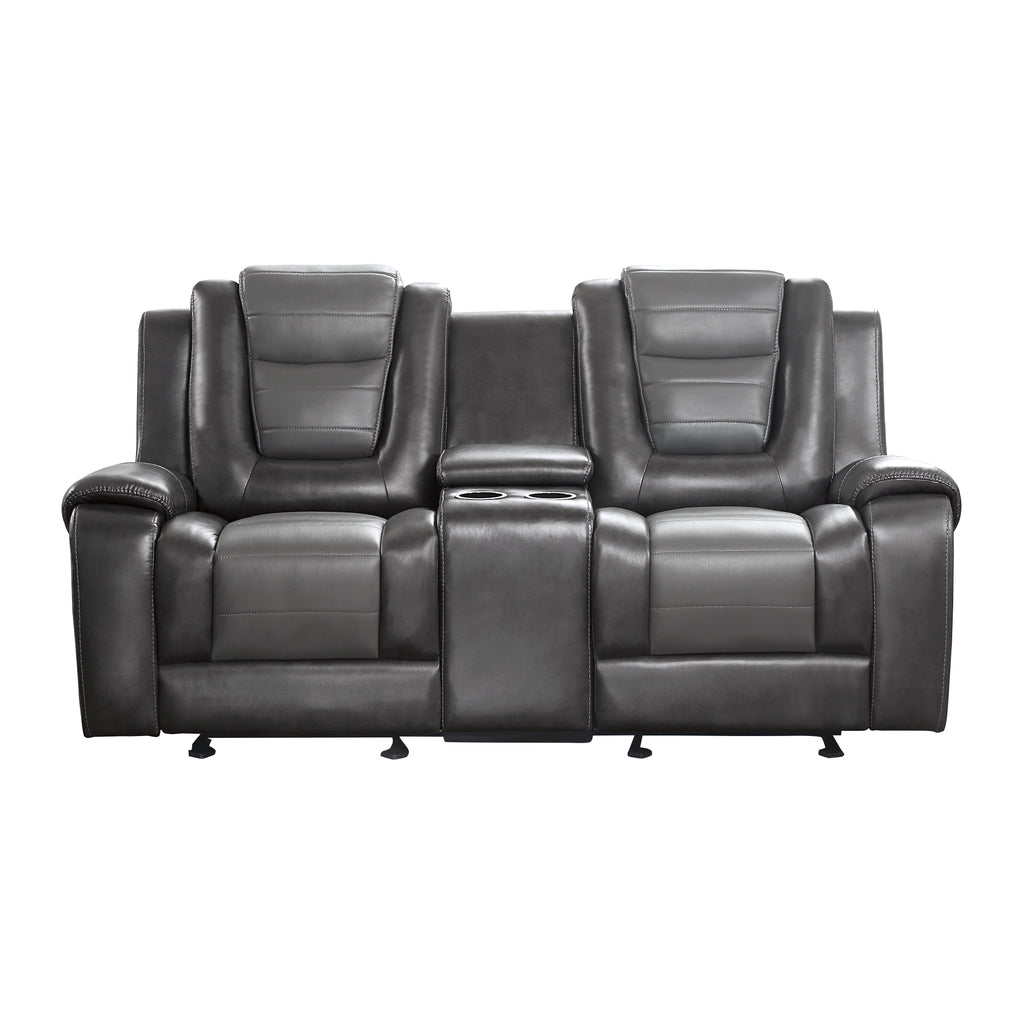 With well-appointed features that create not only a comfortable seating experience but a functional one as well, the Briscoe Collection will be a welcome addition to your home. The brown premium faux leather covering creates a style that will blend effortlessly with your transitional decorative preference. The dual glider reclining ends of the love seat – with center console featuring cupholders and storage, features manual motion mechanisms operating with the pull of a side-mounted tab, that once engaged, take you from seated to reclined in an easy motion.