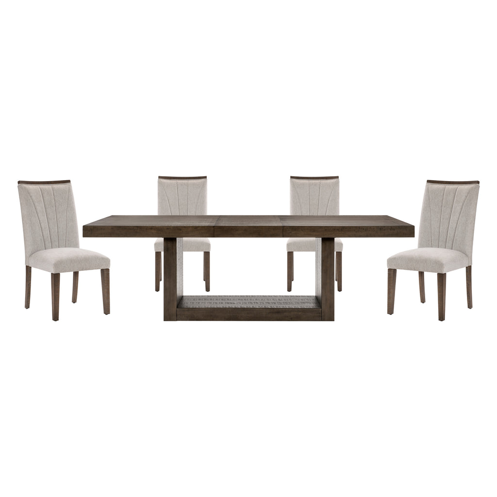 In a break from the minimalistic styling of contemporary design, the Brookings Collection provides a substantial platform for your dining pleasure. The acacia veneer of the collection is treated to a brown finish, its hue a neutral addition to your space. An open box-frame rectangular pedestal supports the tabletop. The collection’s side chairs feature textured gray fabric seats with a wood top-rail and fan-stitched seatbacks. An accompanying server provides ample behind door in-space storage for your linens and tabletop décor. None