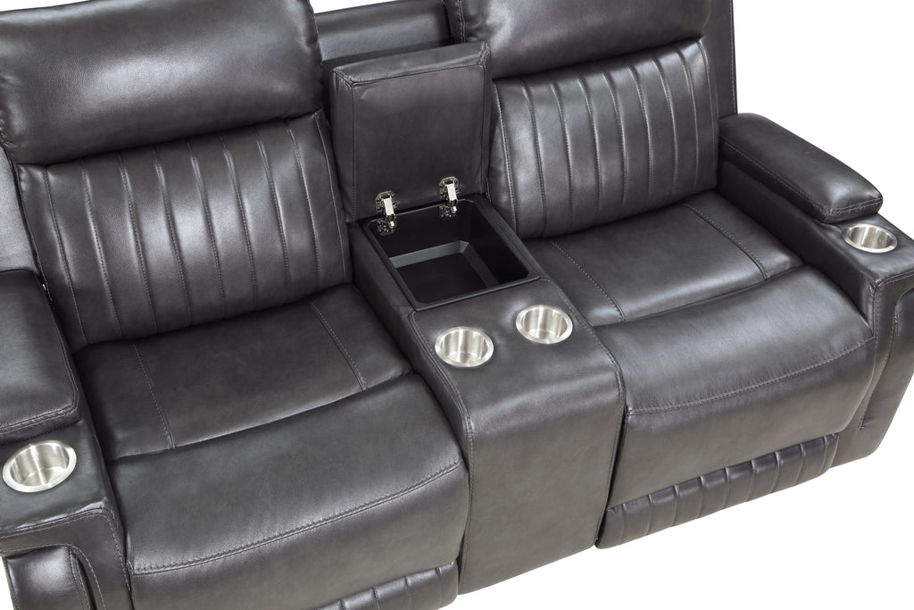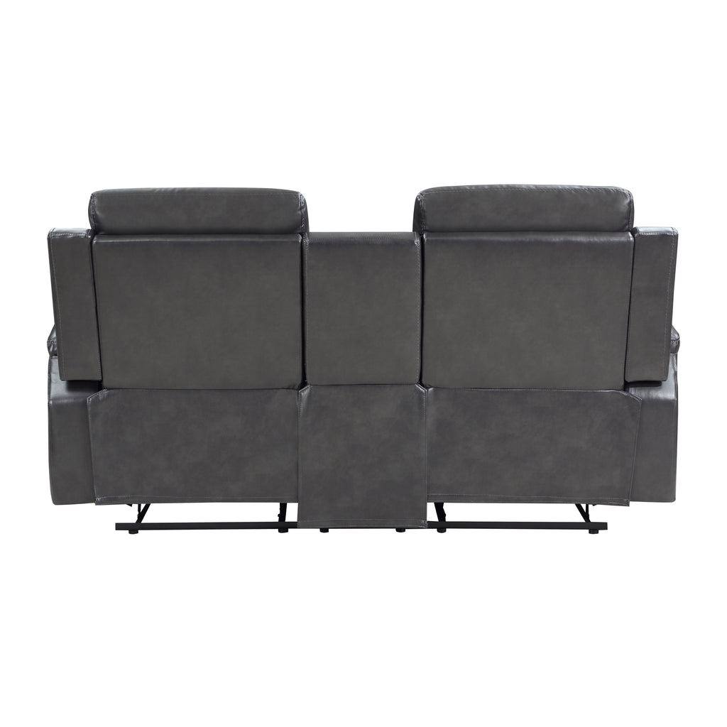 Modern lines and plush comfort comprise the design of the Broomfield Collection. Contour accent stitching fronts the seating of the collection providing contemporary detail, while the gray breathable faux leather lends to your overall comfort. Creature comforts come in the form of the dual recliner love seat with its center console featuring cupholders and hidden storage. The love seat features arm-mounted cupholders and manually engaged tab-pull reclining mechanisms. 72.5 x 38 x 40H