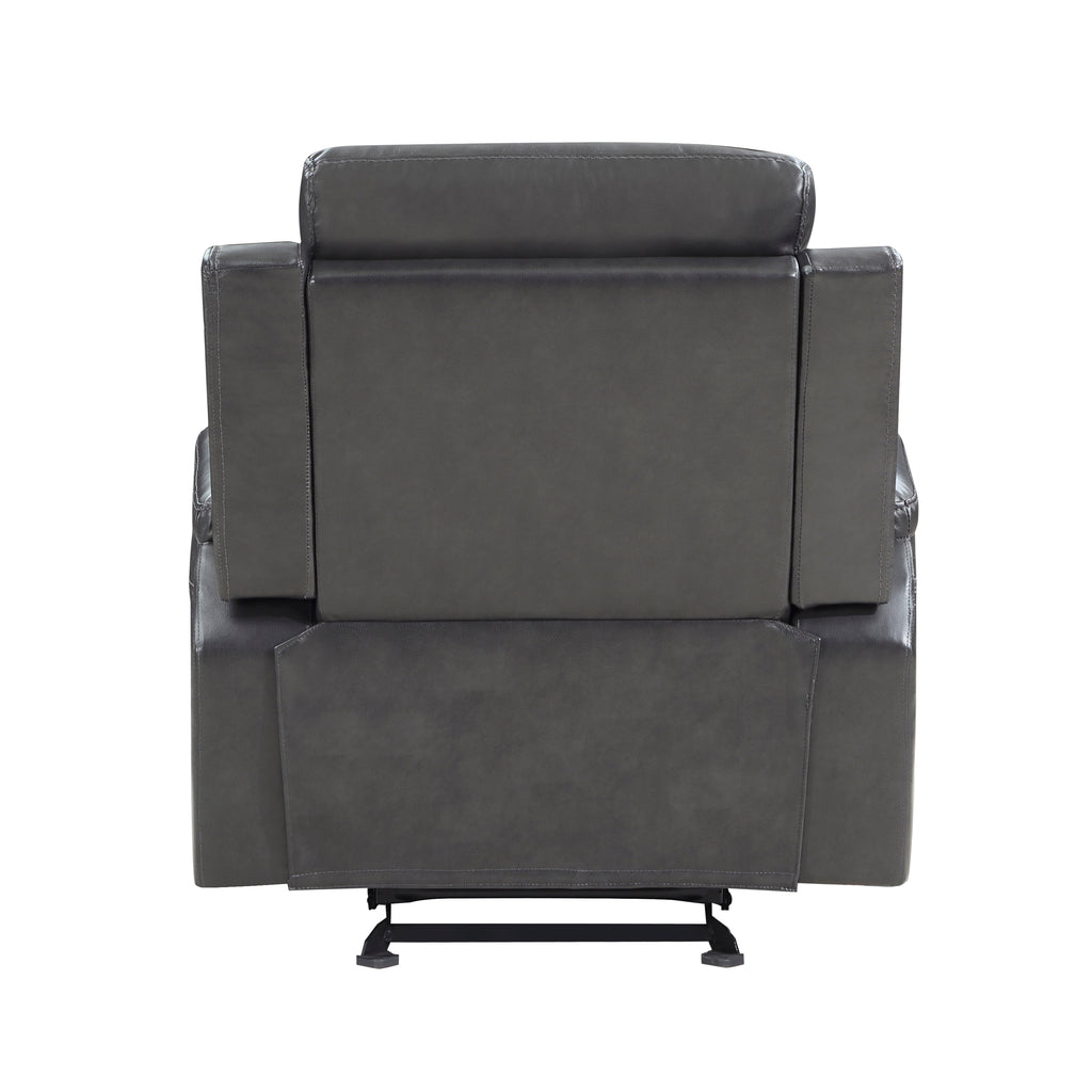 Modern lines and plush comfort comprise the design of the Broomfield Collection. Contour accent stitching fronts the seating of the collection providing contemporary detail, while the gray breathable faux leather lends to your overall comfort. Creature comforts come in the form of the reclining chair with its glider mechanism. The chair features arm-mounted cupholders and manually engaged tab-pull reclining mechanism. 36 x 38 x 40H