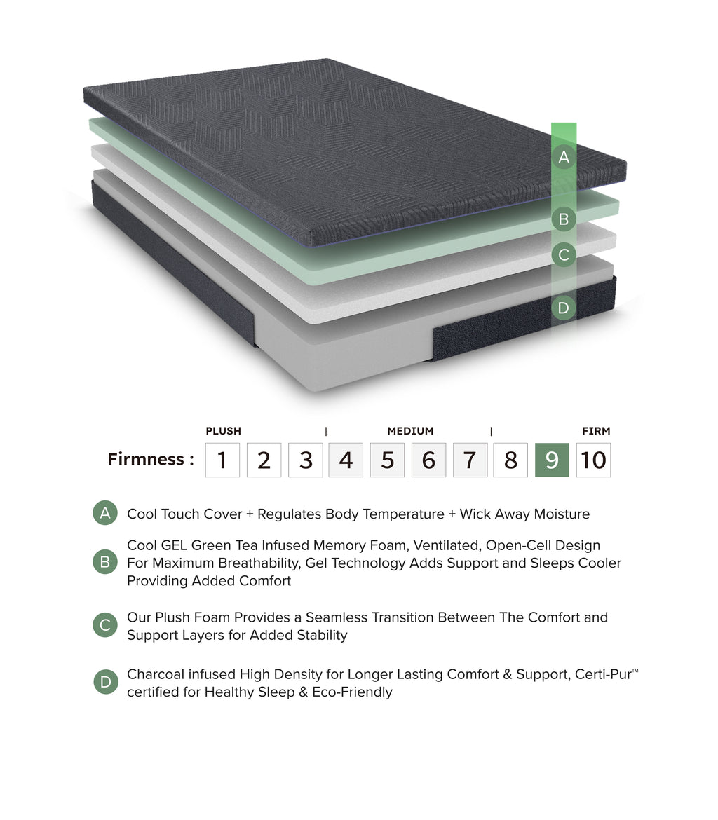- Made of green tea gel-infused memory foam, plush foam and charcoal-infused base foam