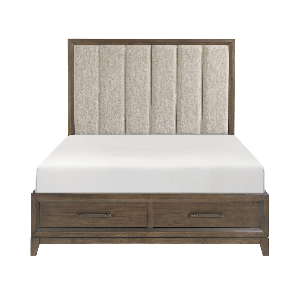 Each design element that creates the classic look of the Cambridge Collection is a study in refined elegance. The prominent grain of the collection’s mindy veneer is highlighted with a dark walnut finish. Black nickel tone hardware provides complementing detail to the storage footboard, dresser, chest, and nightstand. The channel tufted headboard features flaxen chenille fabric, its neutral hue a versatile complement to your space. The low-profile storage footboard creates additional space for convenient placement of clothing or soft goods. None