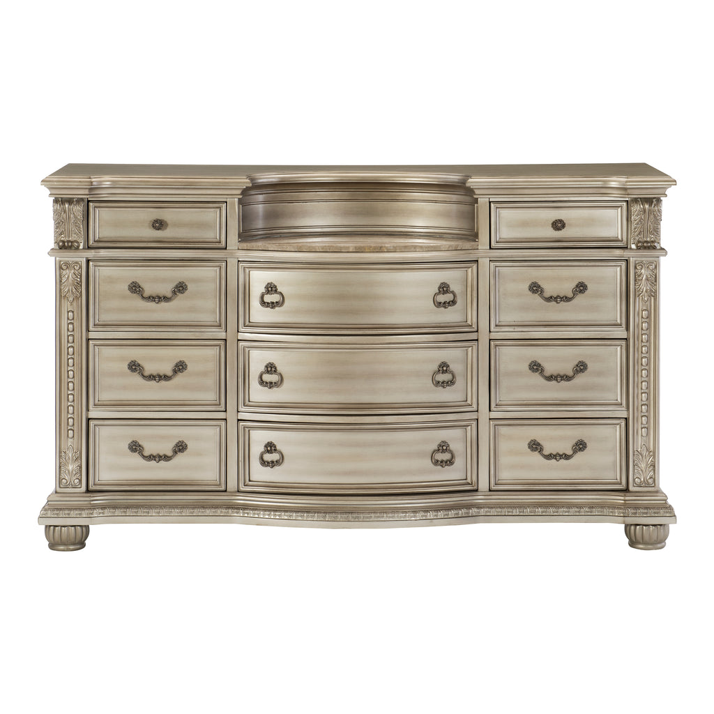 The Cavalier Collection exemplifies the finest in Old World European design inspiration. Egg and dart base moldings, bead molding, acanthus leaf carvings, and genuine marble inset top all blend to achieve an elegant addition for your traditional bedroom. The dresser’s beautiful details are accented by the silver finish on birch veneer.