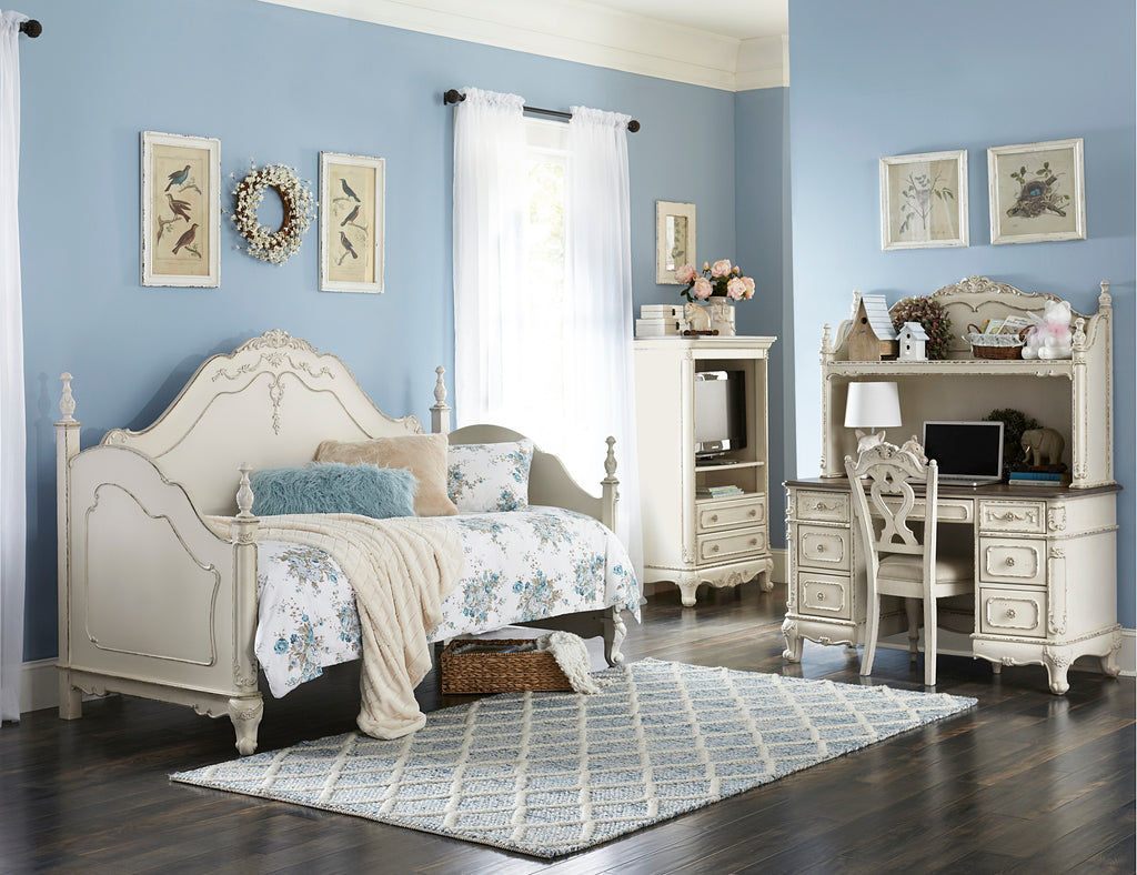 The Cinderella Collection is your little child’s dream come true. The Victorian styling incorporates floral motif hardware and traditional carving details on the white with gray rub-through finished desk hutch that will create the feeling of stepping into a fairy tale. Built in shelving allows for display and storage of desk accessories.
