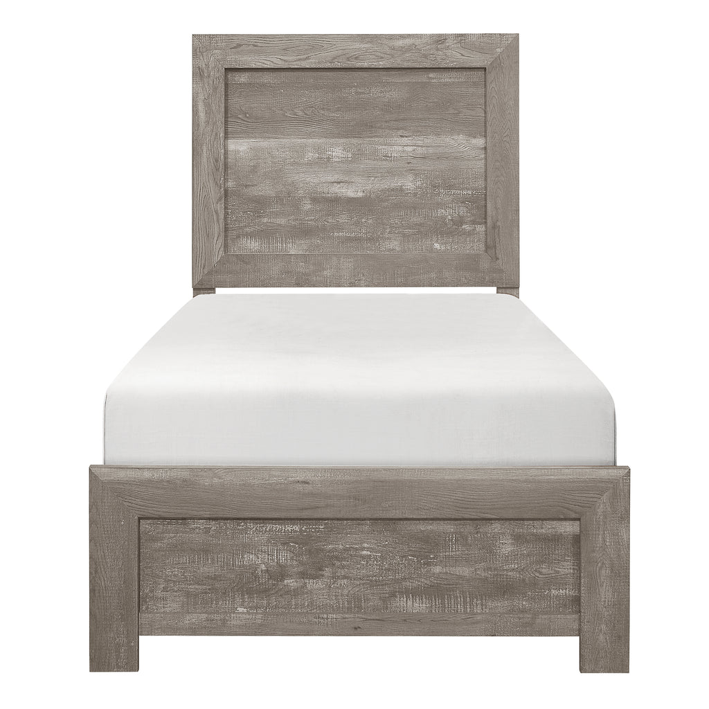 Modern lines and rustic styling are paired to create the look of the Corbin Collection. The 3D printed paper veneer’s texture is highlighted by a gray finish for a realistic wood look. Providing complementing contrast, the drawer fronts of the dresser, chest and nightstand feature black metal hardware. Subtle framing defines the profile of the headboard and footboard, further lending to the unfettered design of the collection. None