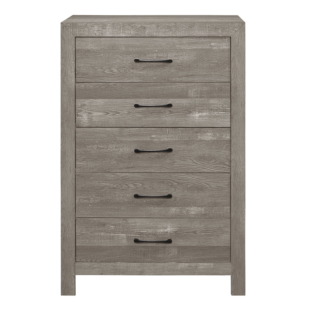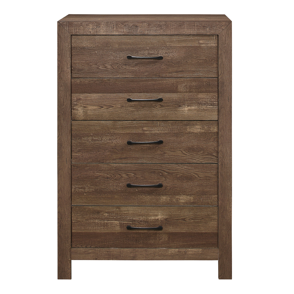 Modern lines and rustic styling are paired to create the look of the Corbin Collection. The 3D printed paper veneer’s texture is highlighted by a brown finish for a realistic wood look. Providing complementing contrast, the drawer fronts of the chest feature black metal hardware. Subtle framing defines the profile of the chest, further lending to the unfettered design of the collection.