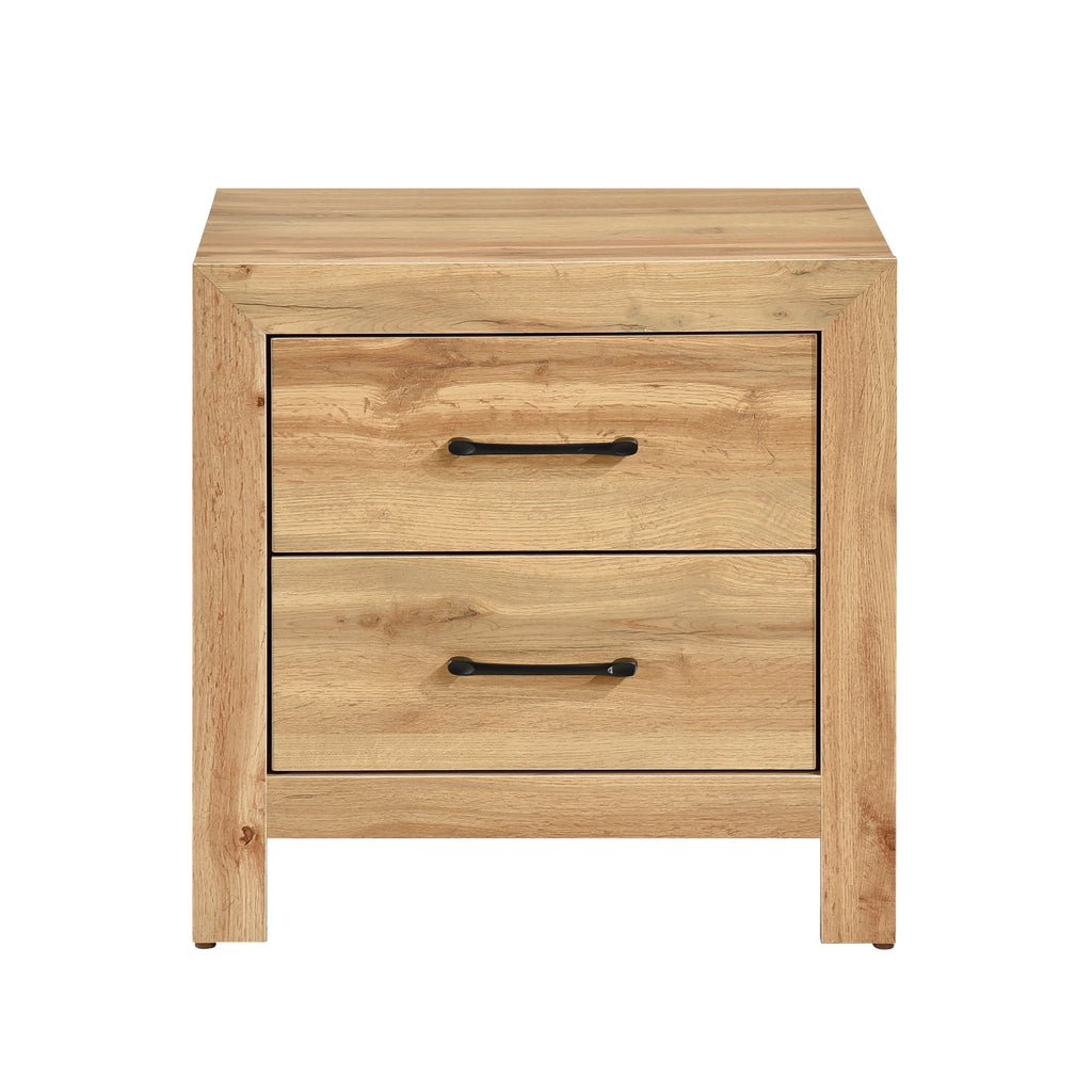 Modern lines and rustic styling are paired to create the look of the Corbin Collection. The 3D printed paper veneer’s texture is highlighted by a brown finish for a realistic wood look. Providing complementing contrast, the drawer fronts of the nightstand feature black metal hardware. Subtle framing defines the profile of the nightstand, further lending to the unfettered design of the collection.