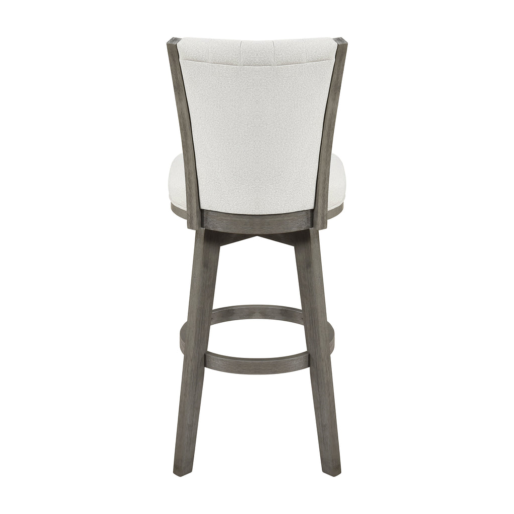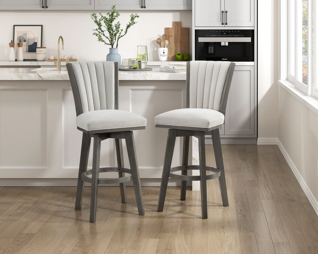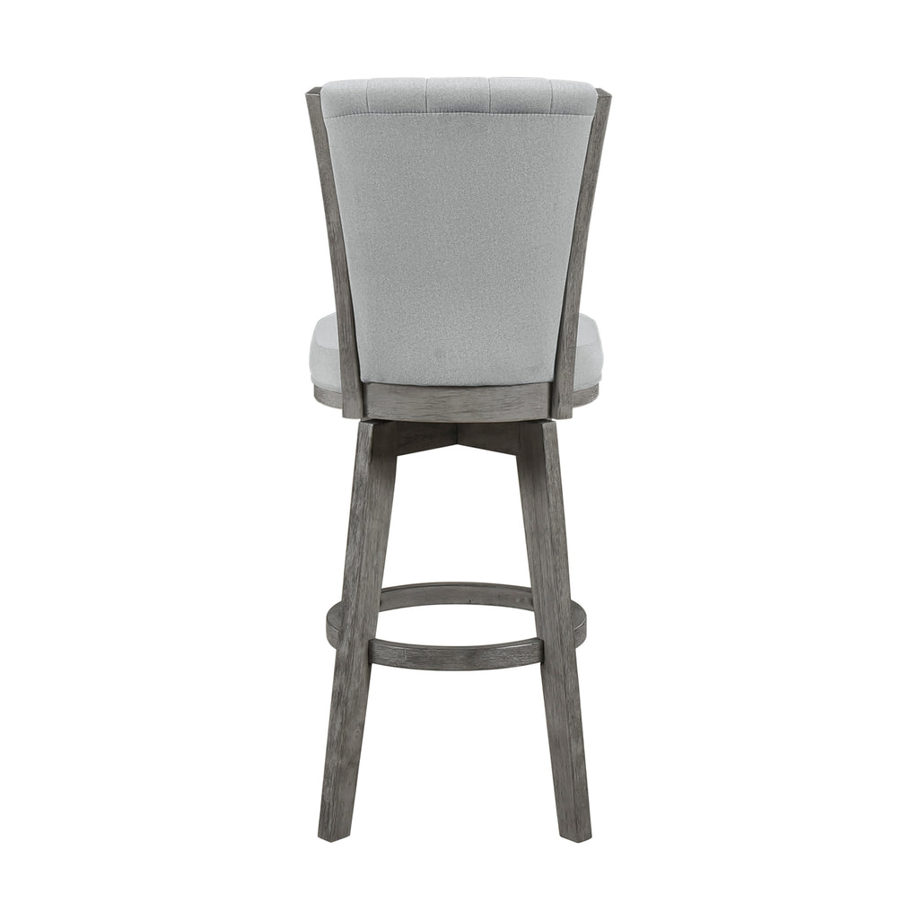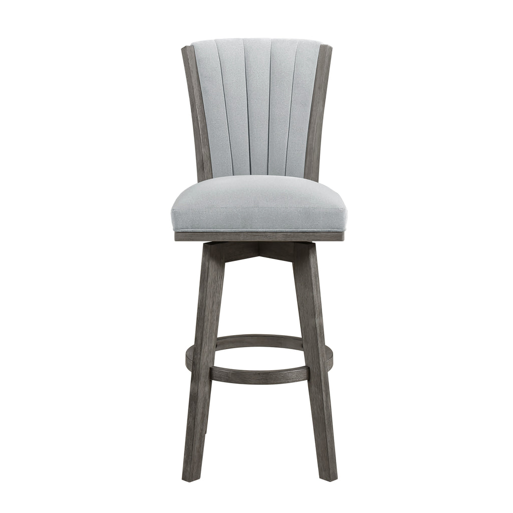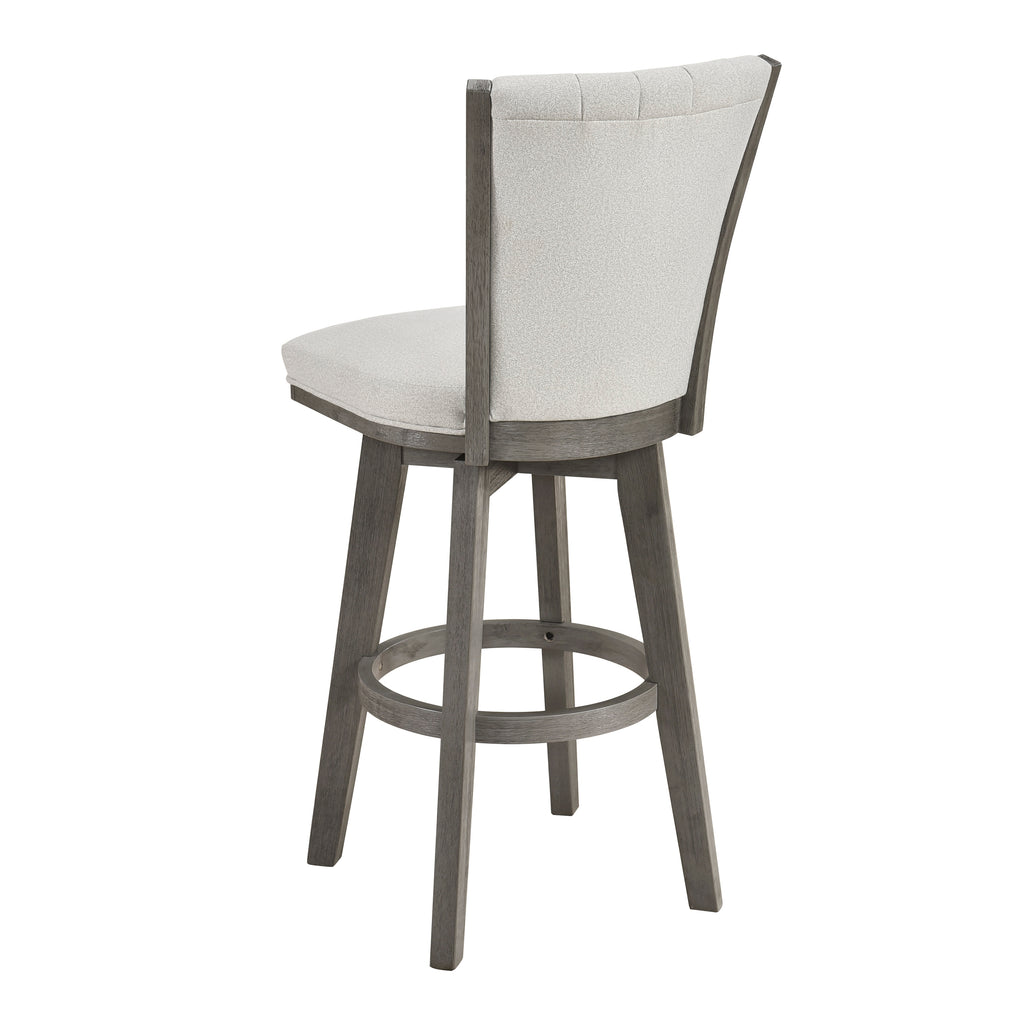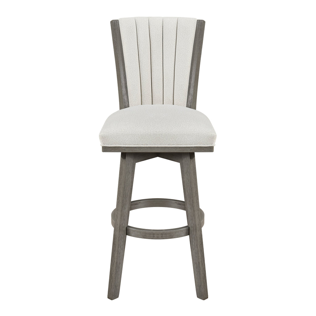 Elevate your home bar or pub table with this chic and comfortable swivel bar chair. The solid wood frame is finished in a wire-brushed gray, providing a modern, textured look that complements a variety of decor styles. The plush beige velvet fabric upholstery and elegant channel tufting on the chair back provide a luxurious feel and a tailored design. Enjoy easy conversation and a full range of motion with the smooth 360-degree swivel feature, while the sturdy footrest ensures a comfortable sitting experience. This chair is the perfect blend of style and functionality, making it an excellent addition to any entertainment area.