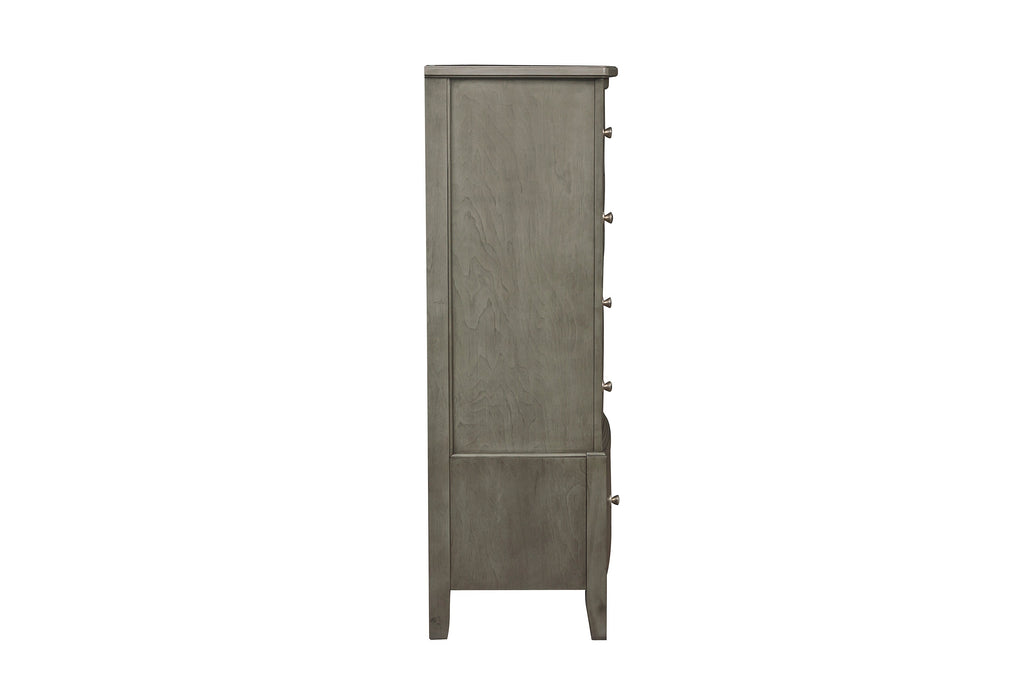 Optimize your bedroom storage with this charming and functional farmhouse chest. Featuring a beautiful beige finish and crafted from a durable blend of Mindy veneer, wood, and engineered wood, this piece is built for both style and longevity. It offers five spacious drawers, providing ample vertical storage for clothing, linens, and accessories. Each drawer is constructed with robust dovetail joints and operates on smooth ball-bearing glides, ensuring easy and quiet access to your belongings. The drawers are accented with elegant satin nickel tone knobs that provide a subtle, modern contrast. Arriving fully assembled, this chest is a hassle-free solution to your storage needs, blending seamlessly with a variety of bedroom decor styles.