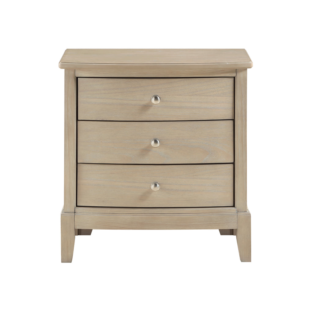 Add a touch of rustic charm and practical storage to your bedside with this beautifully crafted nightstand. Featuring a warm beige finish and made from a blend of Mindy veneer, wood, and engineered wood, this piece seamlessly complements any farmhouse or traditional bedroom decor. The three spacious drawers are constructed with durable dovetail joints and operate on smooth ball-bearing glides, ensuring effortless access to your belongings. Each drawer is accented with a stylish satin nickel tone knob, providing a clean, elegant contrast to the distressed finish. Delivered fully assembled, this nightstand is ready to use right out of the box, making it the perfect hassle-free addition to your home.
