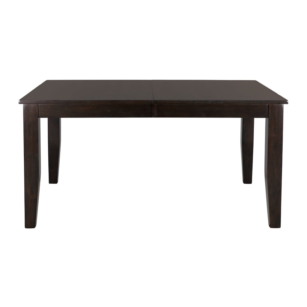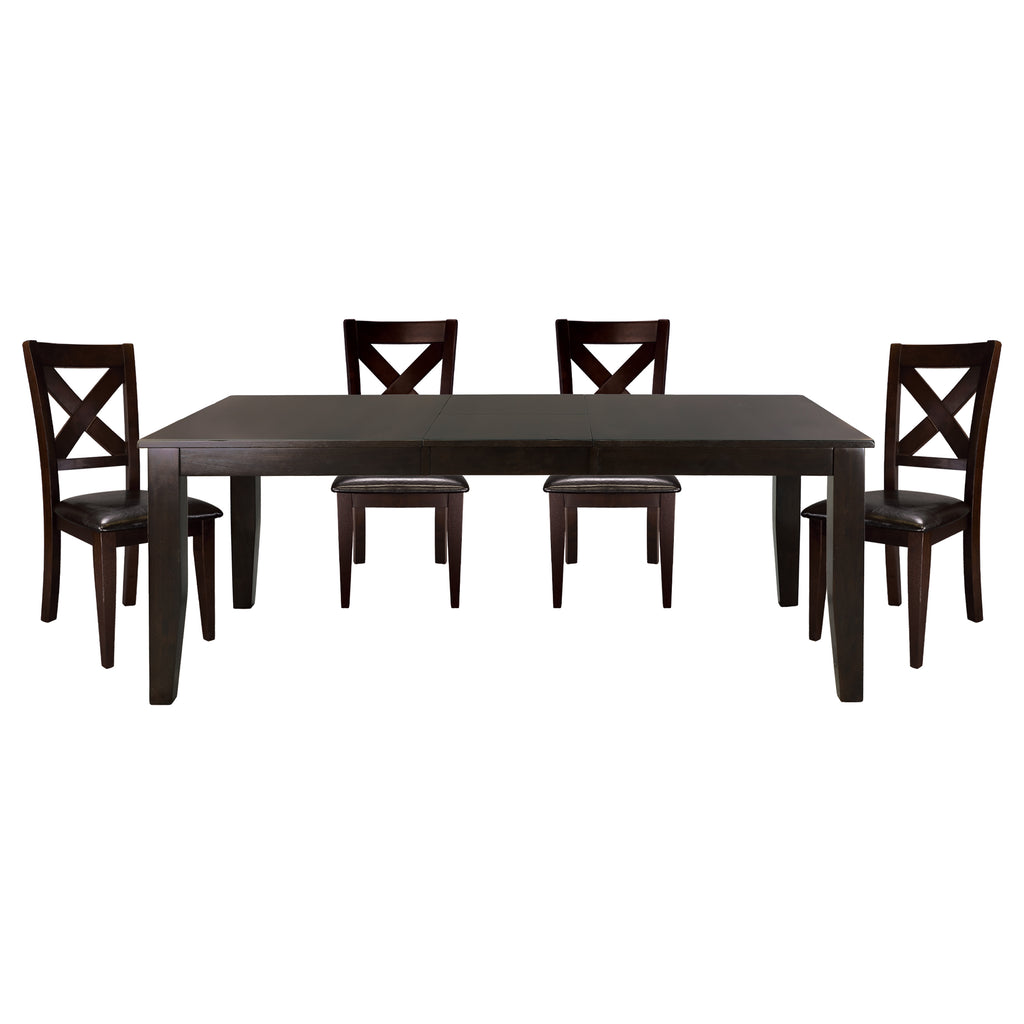 Adorn your dining area with Crown Point Collection. This grand scale casual dining in warm merlot finish is as strong and durable as they are stunning. Table top is constructed of mango veneer with strong support tapered legs. Attractive X-back dining chair with comfortable leather-look brown seat completes the unsophisticated streamlined look. None