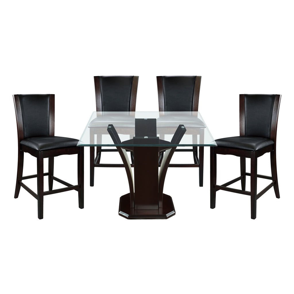 Daisy Collection combines superb visual appearance and fine quality that you need in your dining area. Three distinct elegant flared tulip bases support beveled glass tabletops on the square counter height table. Counter height chairs feature clean lines and sleek curves; available in both white faux leather and dark brown faux leather. The set is constructed of hardwood solids and veneers in a refreshing espresso finish. None