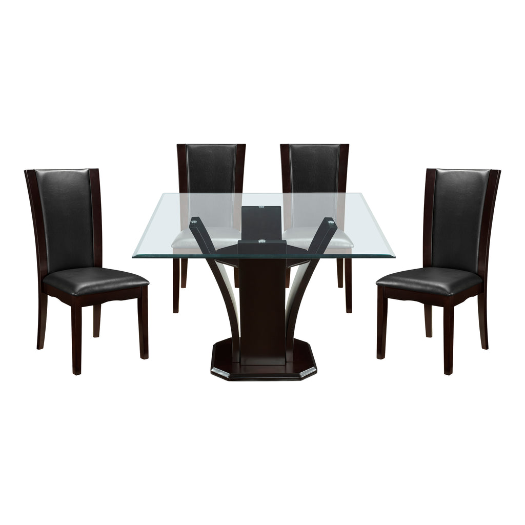 Daisy Collection combines superb visual appearance and fine quality that you need in your dining area. Three distinct elegant flared tulip bases support beveled glass tabletops on the square traditional dining height tables. Additional offering is the trestle table with black glass insert. Dining height chairs feature clean lines and sleek curves; available in both white faux leather and dark brown faux leather. The set is constructed of hardwood solids and veneers in a refreshing espresso finish. None