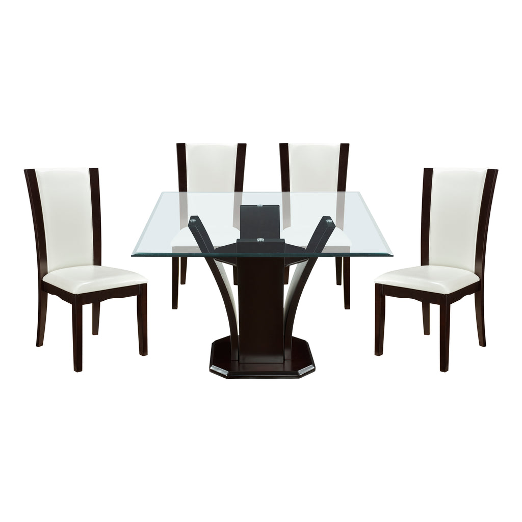 Daisy Collection combines superb visual appearance and fine quality that you need in your dining area. Three distinct elegant flared tulip bases support beveled glass tabletops on the square traditional dining height tables. Additional offering is the trestle table with black glass insert. Dining height chairs feature clean lines and sleek curves; available in both white faux leather and dark brown faux leather. The set is constructed of hardwood solids and veneers in a refreshing espresso finish. None