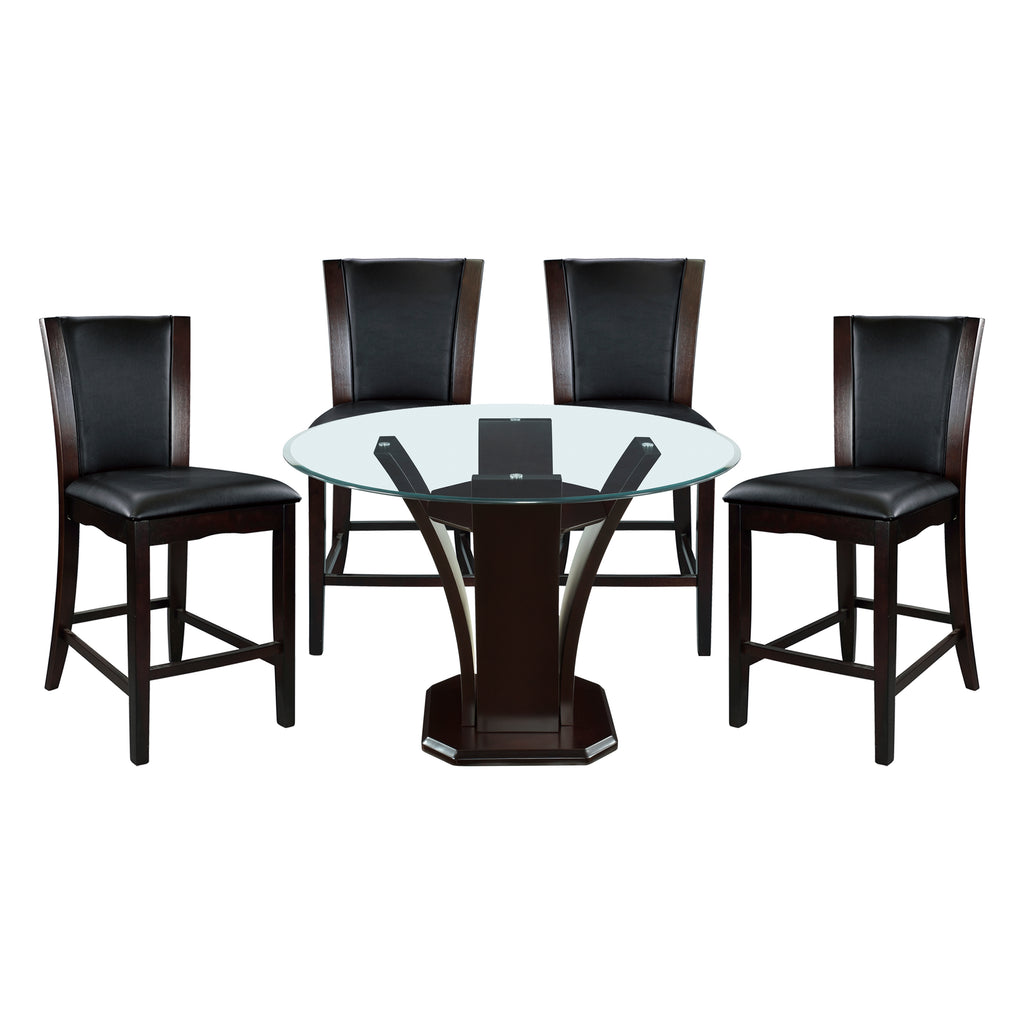 Daisy Collection combines superb visual appearance and fine quality that you need in your dining area. Three distinct elegant flared tulip bases support beveled glass tabletops on the round counter height table. Counter height chairs feature clean lines and sleek curves; available in both white faux leather and dark brown faux leather. The set is constructed of hardwood solids and veneers in a refreshing espresso finish. None