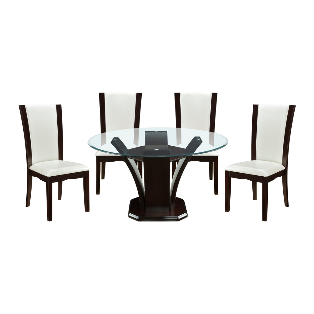 Daisy Collection combines superb visual appearance and fine quality that you need in your dining area. Three distinct elegant flared tulip bases support beveled glass tabletops on the rectangular and round traditional dining height tables. Additional offering is the trestle table with black glass insert. Dining height chairs feature clean lines and sleek curves; available in both white faux leather and dark brown faux leather. The set is constructed of hardwood solids and veneers in a refreshing espresso finish. None