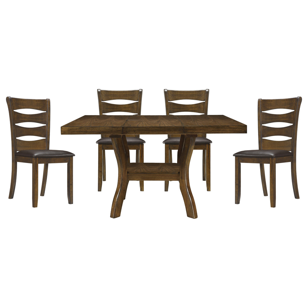 The transitional styling is paired with convenient function to create the Darla Collection. Brown finish highlights the distinct grain of the mindy veneer of the table and accompanying chairs. The folding butterfly leaf allows for quick expansion of the table and convenient storage underneath the table’s top while an under-table shelf allows for open display for tabletop accessories. Pairing with the table are wood framed chairs which feature brown faux leather seats, perfectly complementing the collection’s finish. None