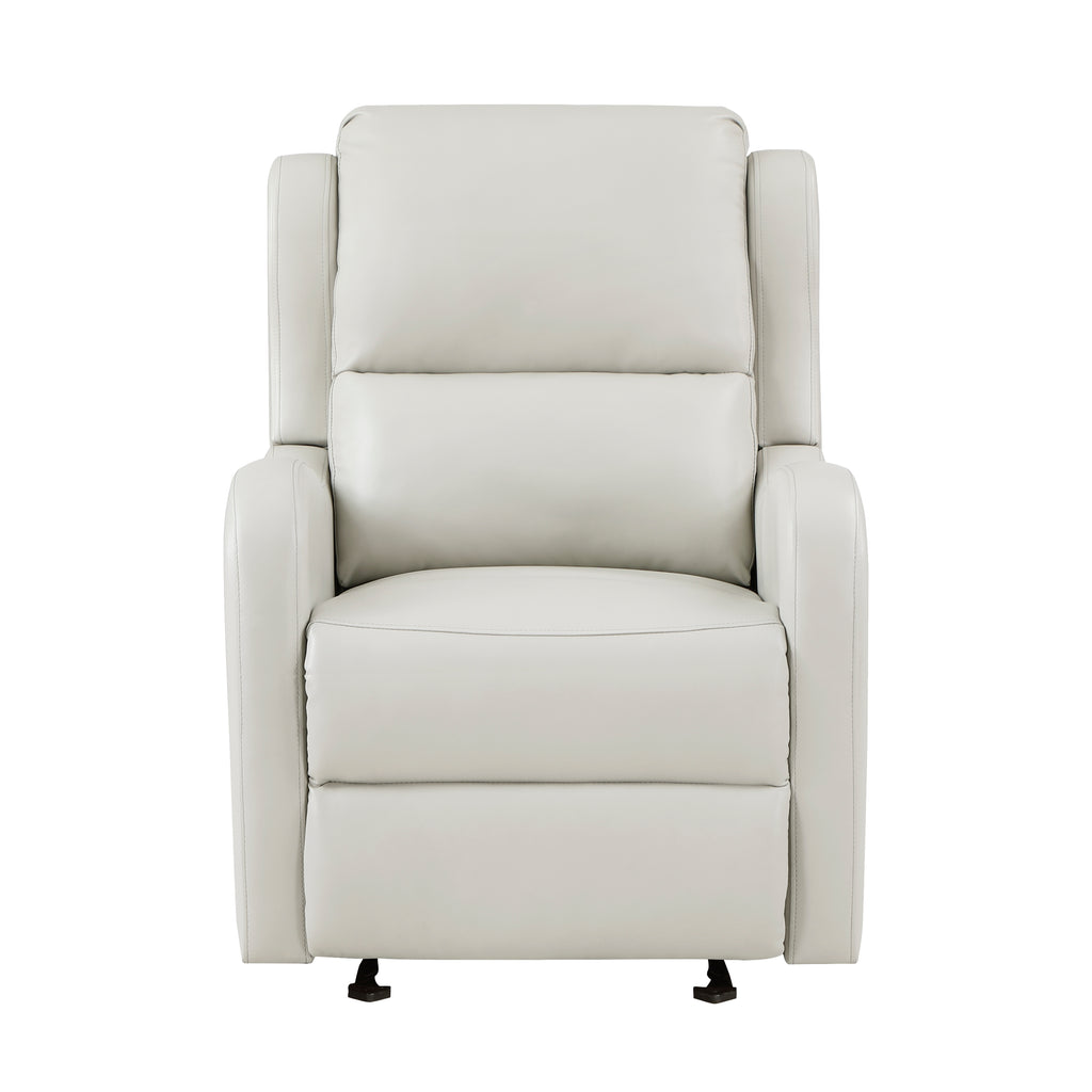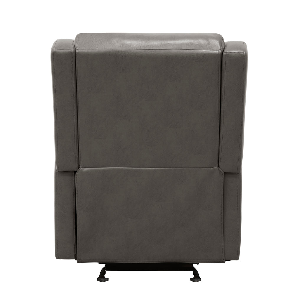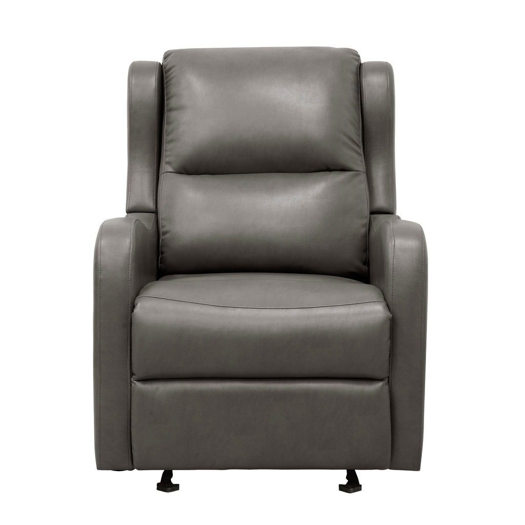 Whether used as a stand-alone piece or as a complement to your existing living room seating, the Durant Collection provides a welcoming seat to your home’s décor. The streamlined profile of the glider reclining chair is covered in black faux leather. The reclining mechanism is engaged with a pull to the side mounted tab, elevating the footrest and lowering the seatback, while the gentle gliding mechanism provides smooth motion to your seated experience.