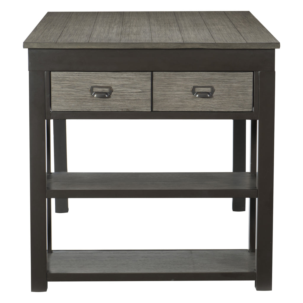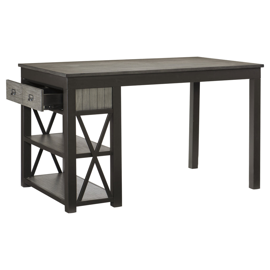 Inspired by industrial environments, the Elias Collection presents a functional modern aesthetic to your casual dining space. Acacia veneer features a gray finish that is perfectly contrasted by the gunmetal gray finished wood framing that provides support. The table features a bookcase side support which features open display as well as drawer storage allowing for easy access to your tabletop items 36 x 60 x 36H