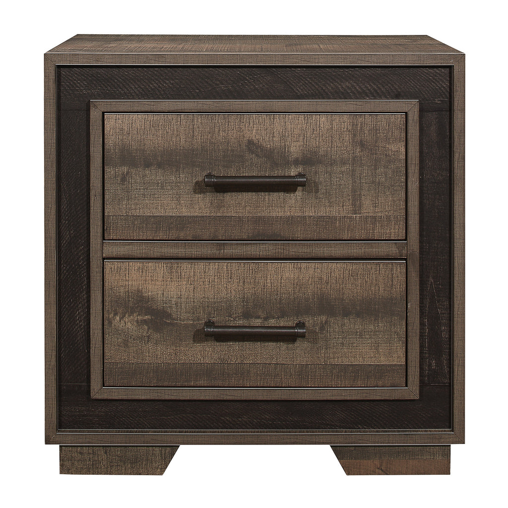 Modern lines and rustic aesthetic intersect in the design of the Ellendale Collection. Embossed faux-wood veneer creates the look of authentic mahogany finished wood planks, framed with contrasting embossed faux-wood veneer in a dark ebony. Distressed pewter finished bar hardware provides contrast to the drawer fronts of the nightstand.